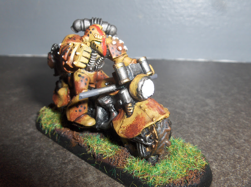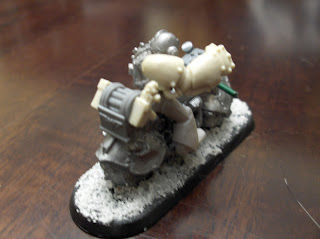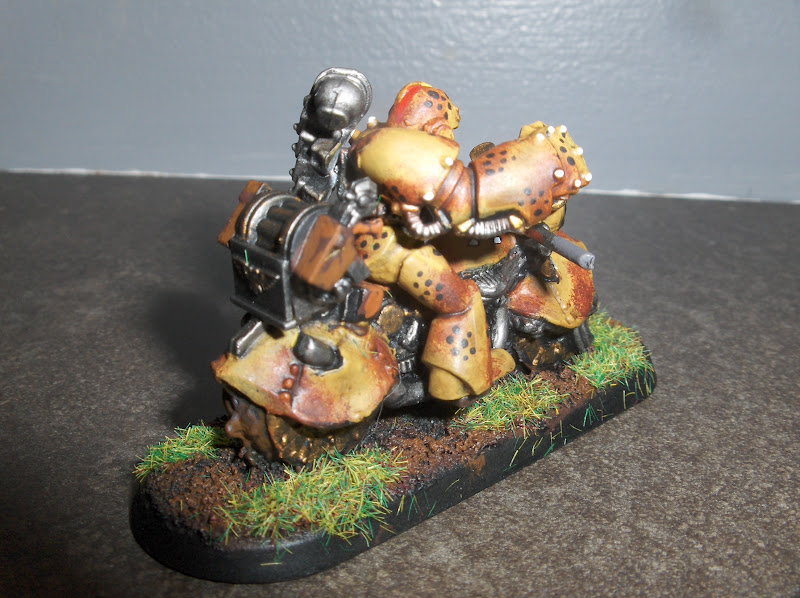 You can see half an ammo drum on the back, with an Imperial sigil plate (part of an IG ammo box I think) along with the rider's holstered bolt pistol and an ammo pouch.