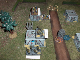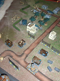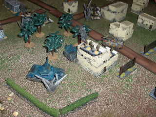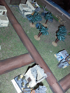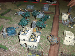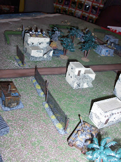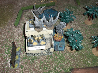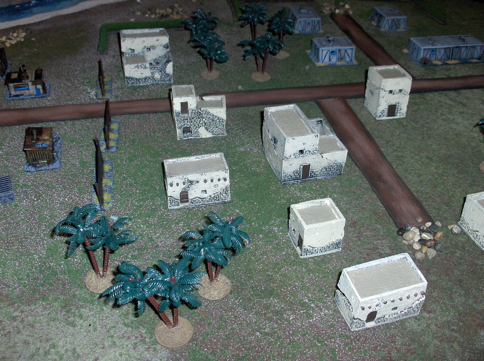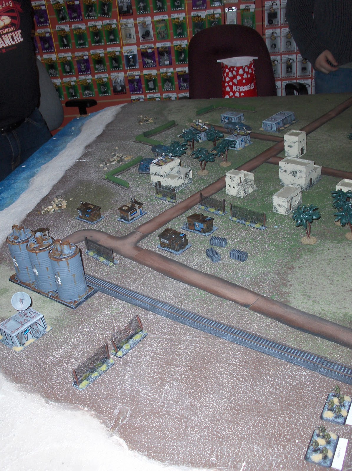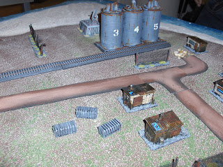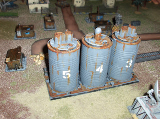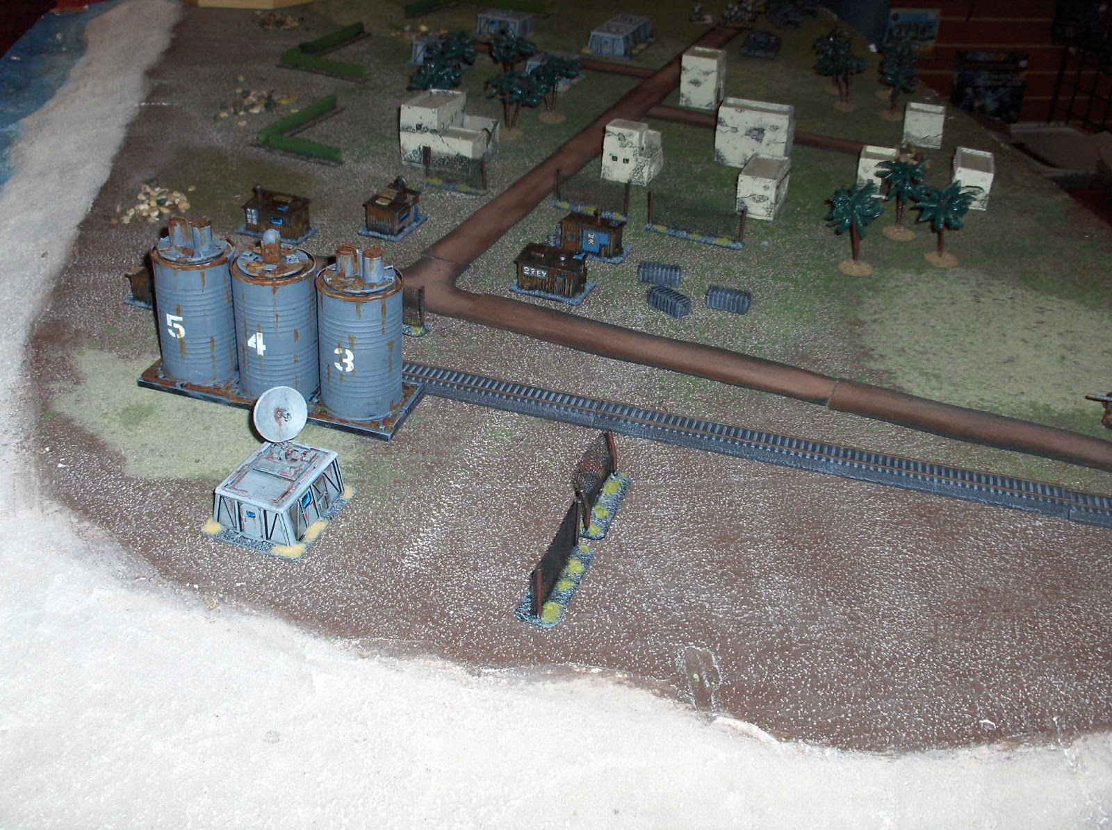 I was actually pretty impressed with the terrain board that we got to use at the store - it was a 6x4 board with beach on two sides. I'd just happened to bring out palm trees for the vegetation component so it worked out perfectly. We set up a small urban area around a chemical refinery which was conveniently placed to discharge maximum effluent into the local aqueous ecosystem... 'cause that's the way Binary Petroleum rolls ;-)