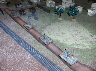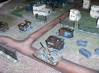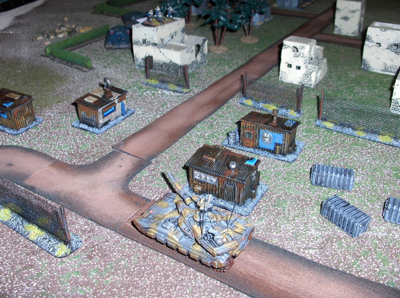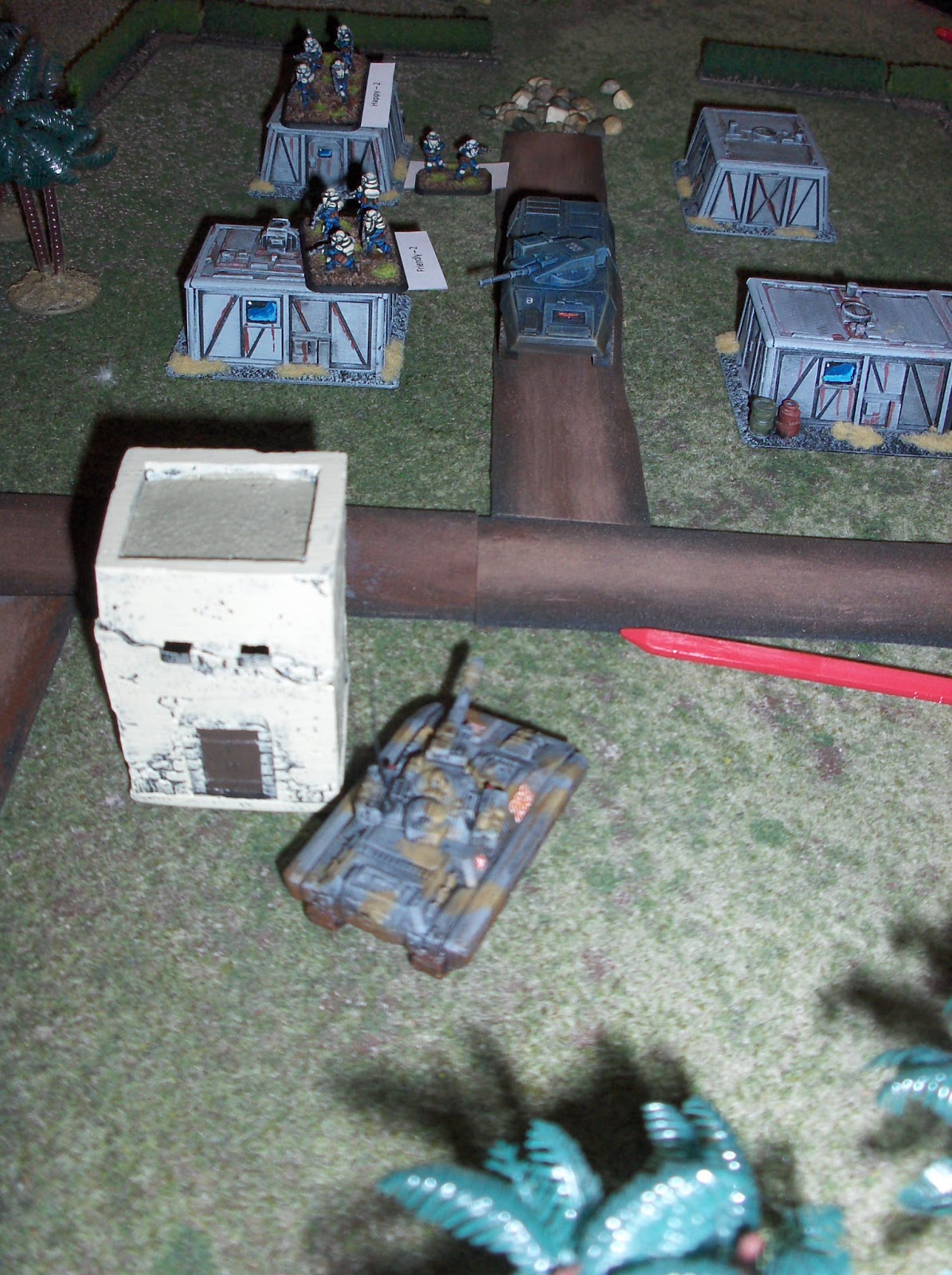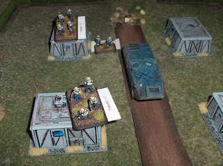 On to the game... the scenario was that the Earth Force had been ordered to take control of the area. Unfortunately the Control Battalion had gotten there first. You can see the CB initial positions in the photo above - CB squad on the roof of the building at centre left, with their MBT behind that. The rest of the CB deployed to the northeast of that position. EF would enter on the road at bottom right. The EF had 10 turns to break the CB force.