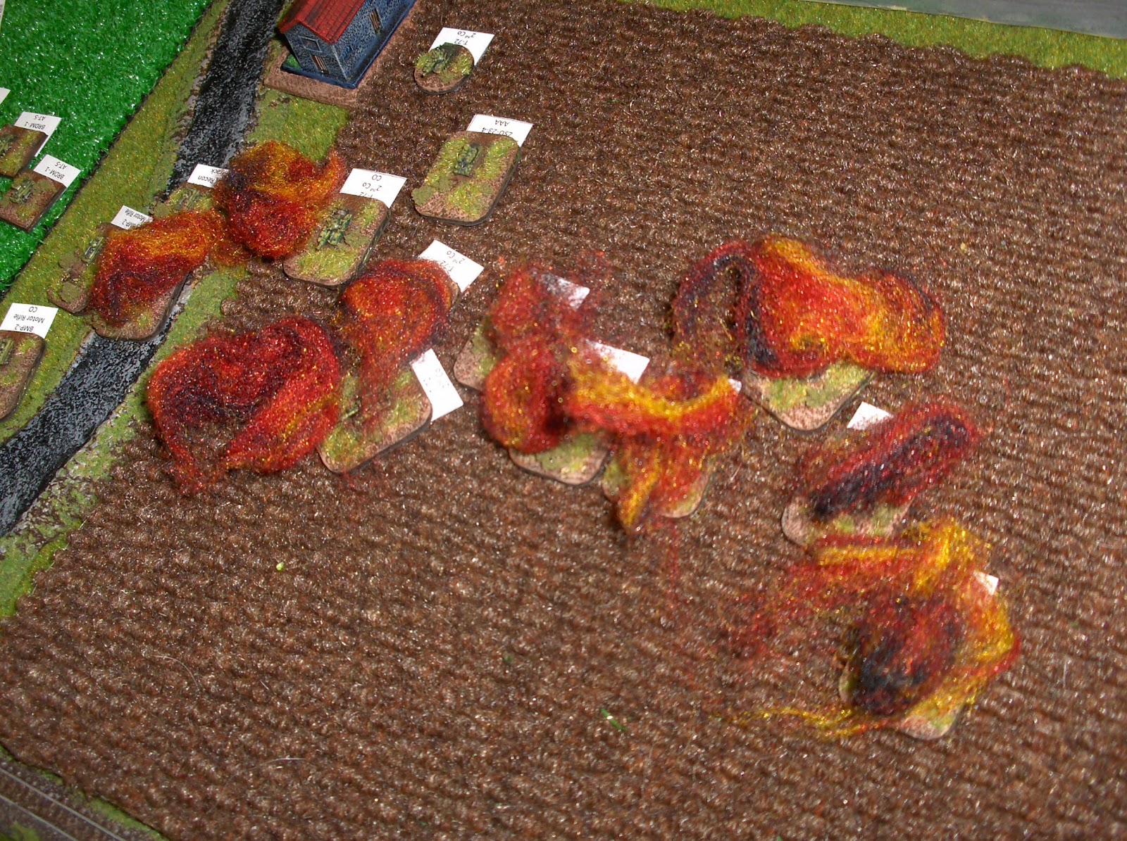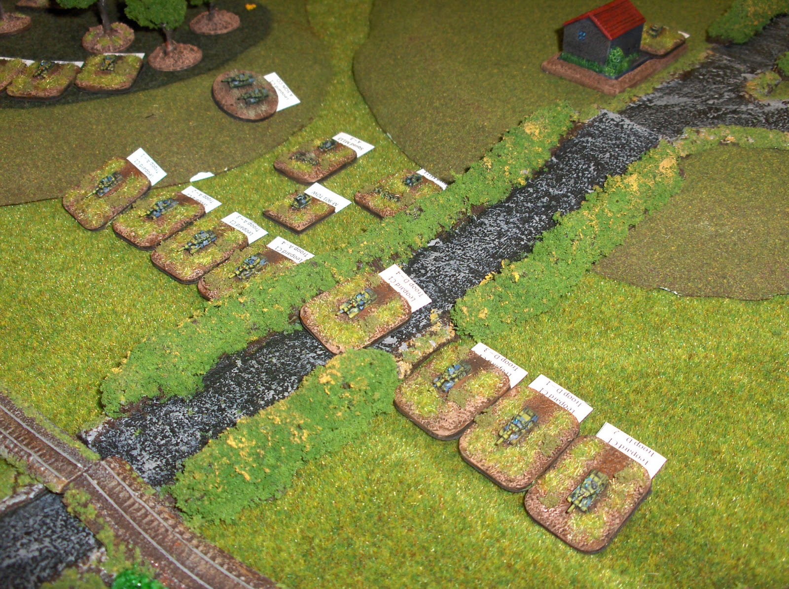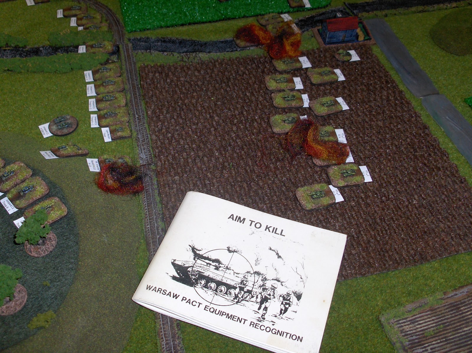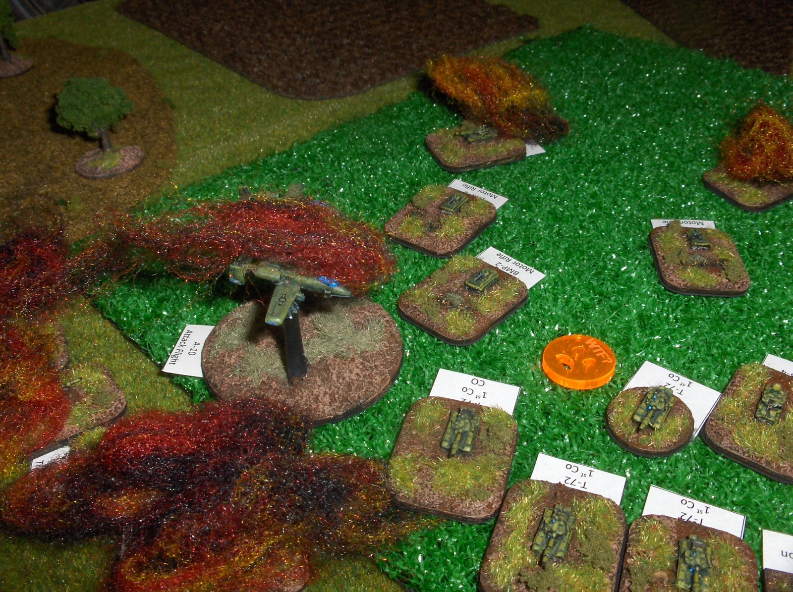View from the north (Soviet) table edge, looking south down Highway 10 towards Boissevain. The attacking force had 10 turns to break the Canadians - basically by destroying half or more of their units and hoping for a failed morale test. The Soviets attacked with two companies of T-72s and an armoured infantry battalion, plus artillery and air assets. The Canadians deployed two understrength Leopard companies and some infantry in M113s, some artillery tubes and A-10 Warthog ground-attack aircraft.