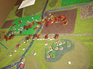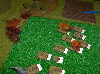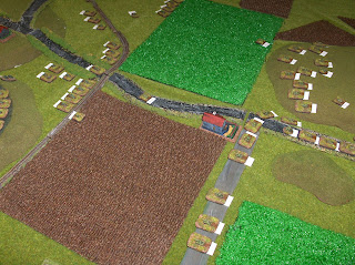 Off we go! The Soviet column (T-72 company) moves down the road followed up by armoured infabtry. The other tank company stages in the field to the right. Artillery park is in the wooded depression.