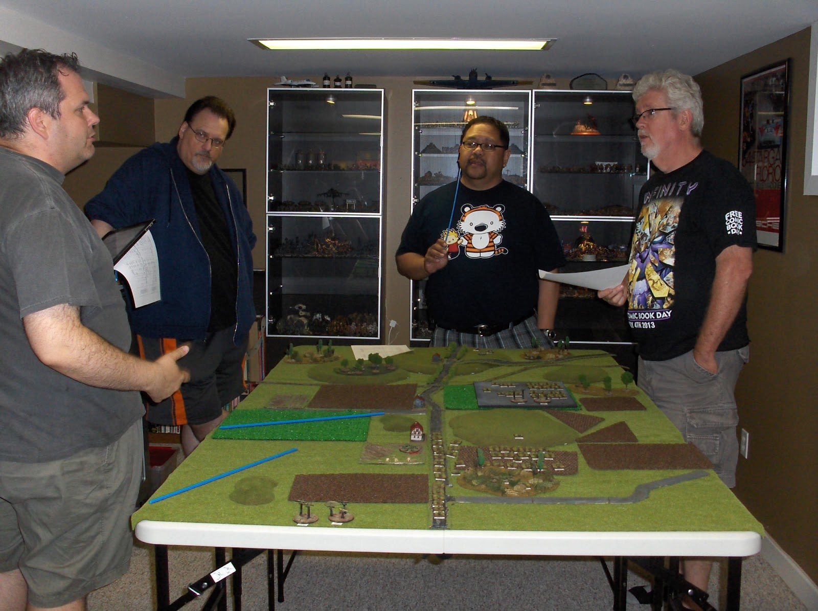 Greg explains the situation to Conscripts Kevin, Dave V. and Jim. Greg had designed the game using the tried and true "Spearhead" rules, but with each 3mm individually based tank representing one actual vehicle.