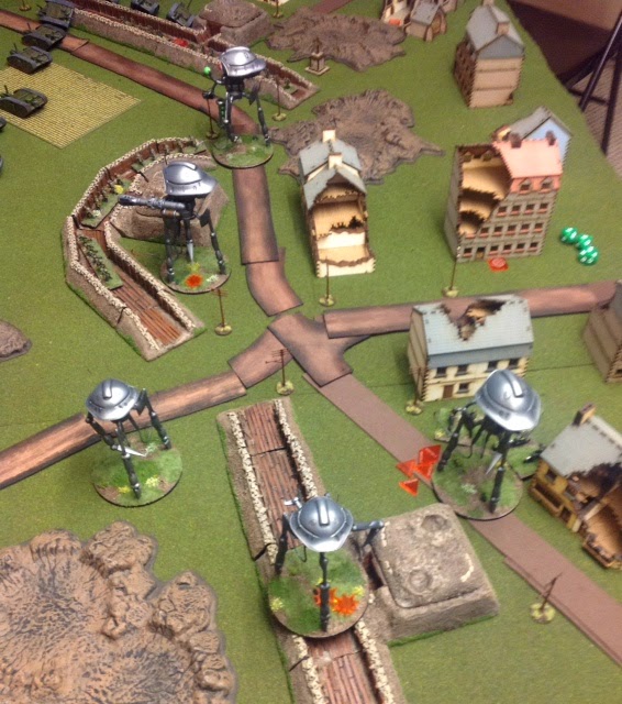 Players rolled off and the Humans got the first move. They responded by revealing their tanks and moving up to fire. They were able to get several hits from the two units of Mark III's that had deployed in the right hand side of the town. They scored a critical hit on a scout tripod and took off 5 armour in a single hit, which would make it very vulnerable later on. They also scored a hit on an assault tripod and took of a single point of armour.