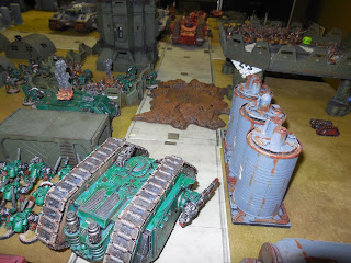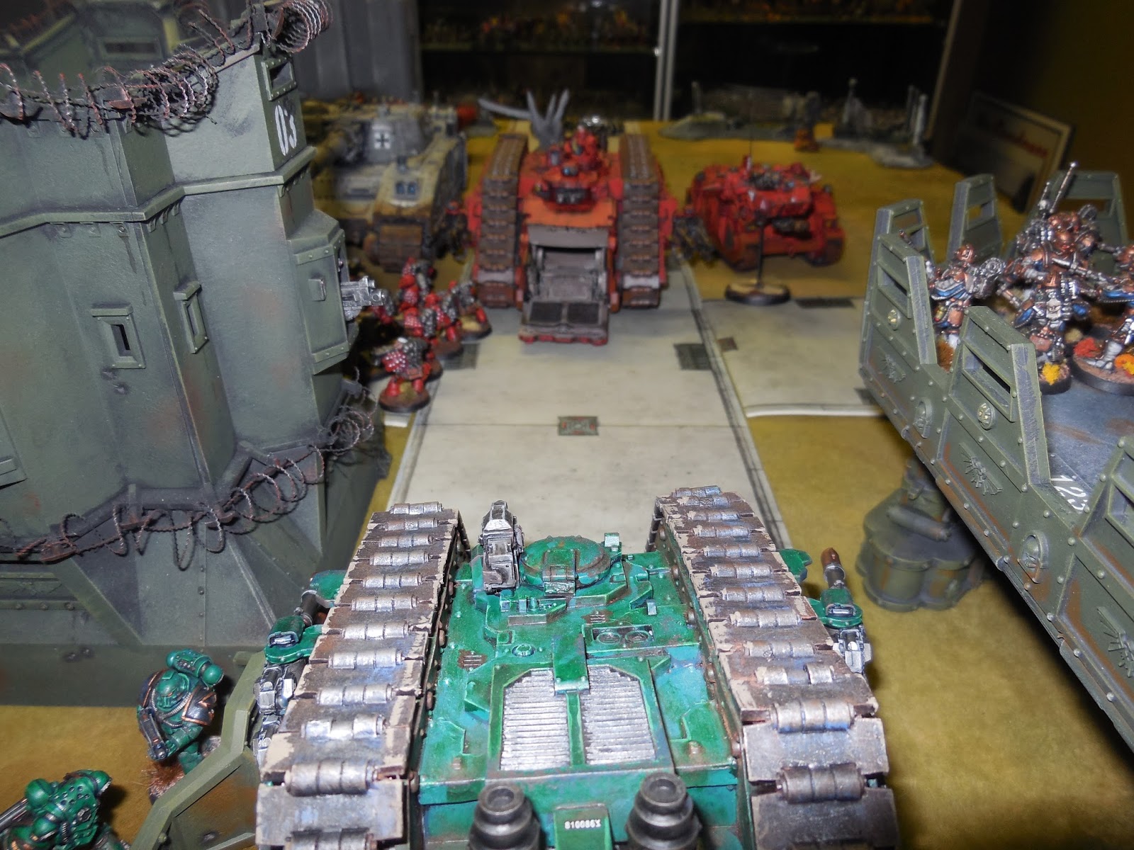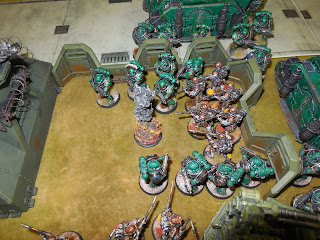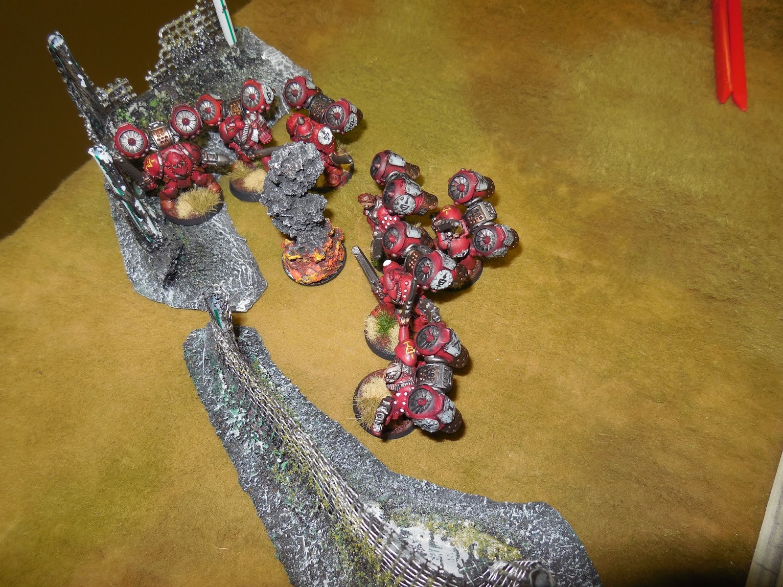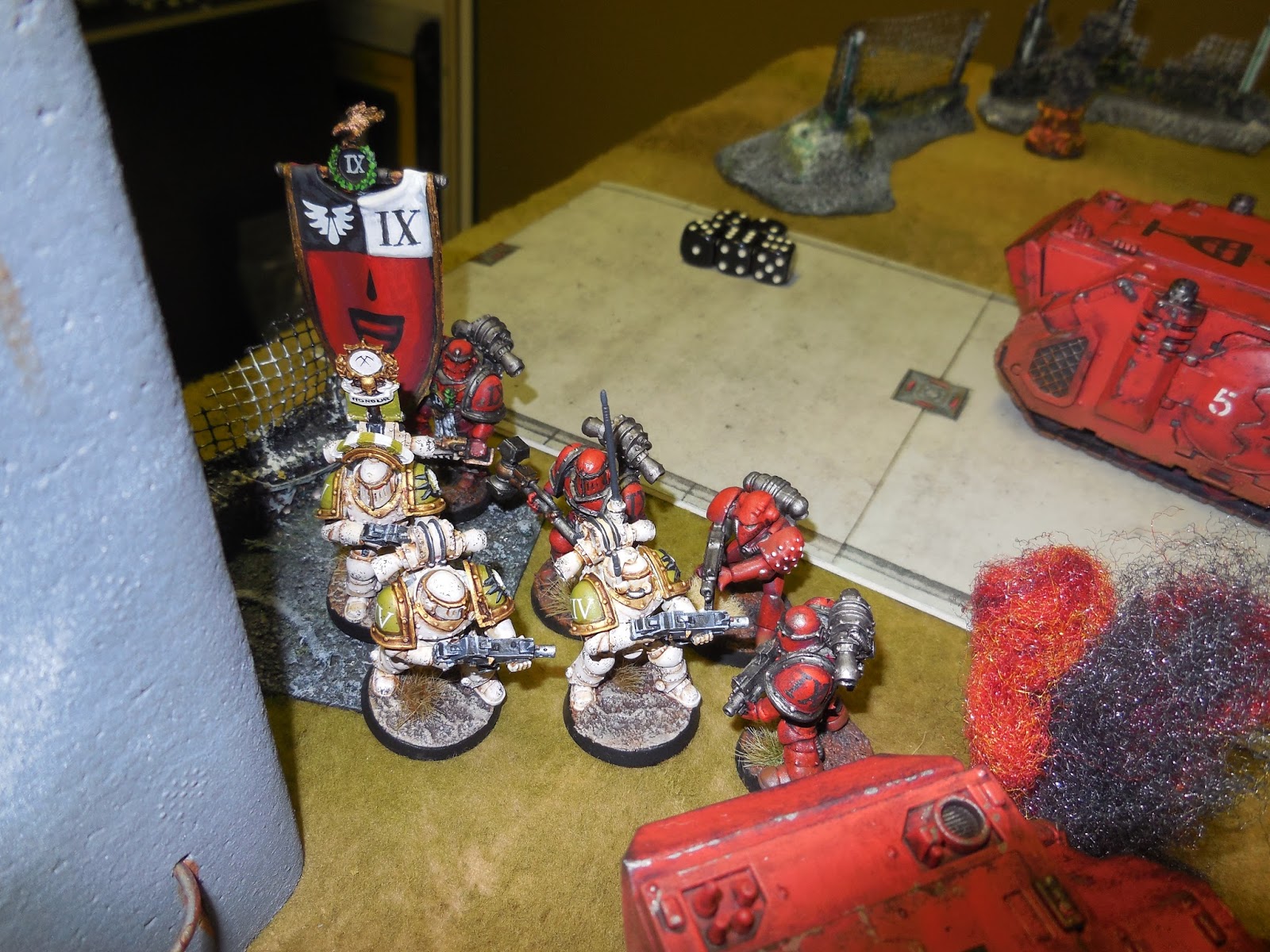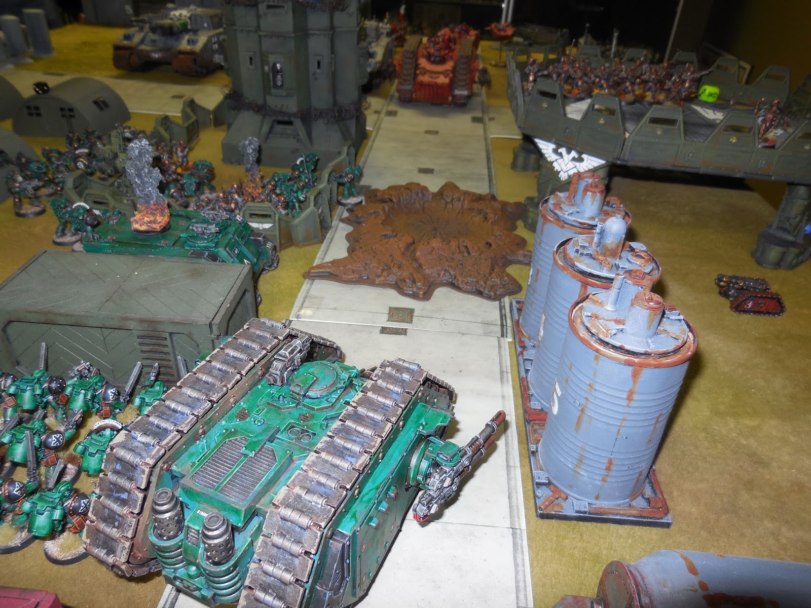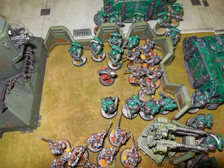 The Sons of Horus formed up for a last push on the bastion. The crater at centre is where their Rhino once sat; the laser destroyer array on the SPARTAN!!! had done as the name indicated.