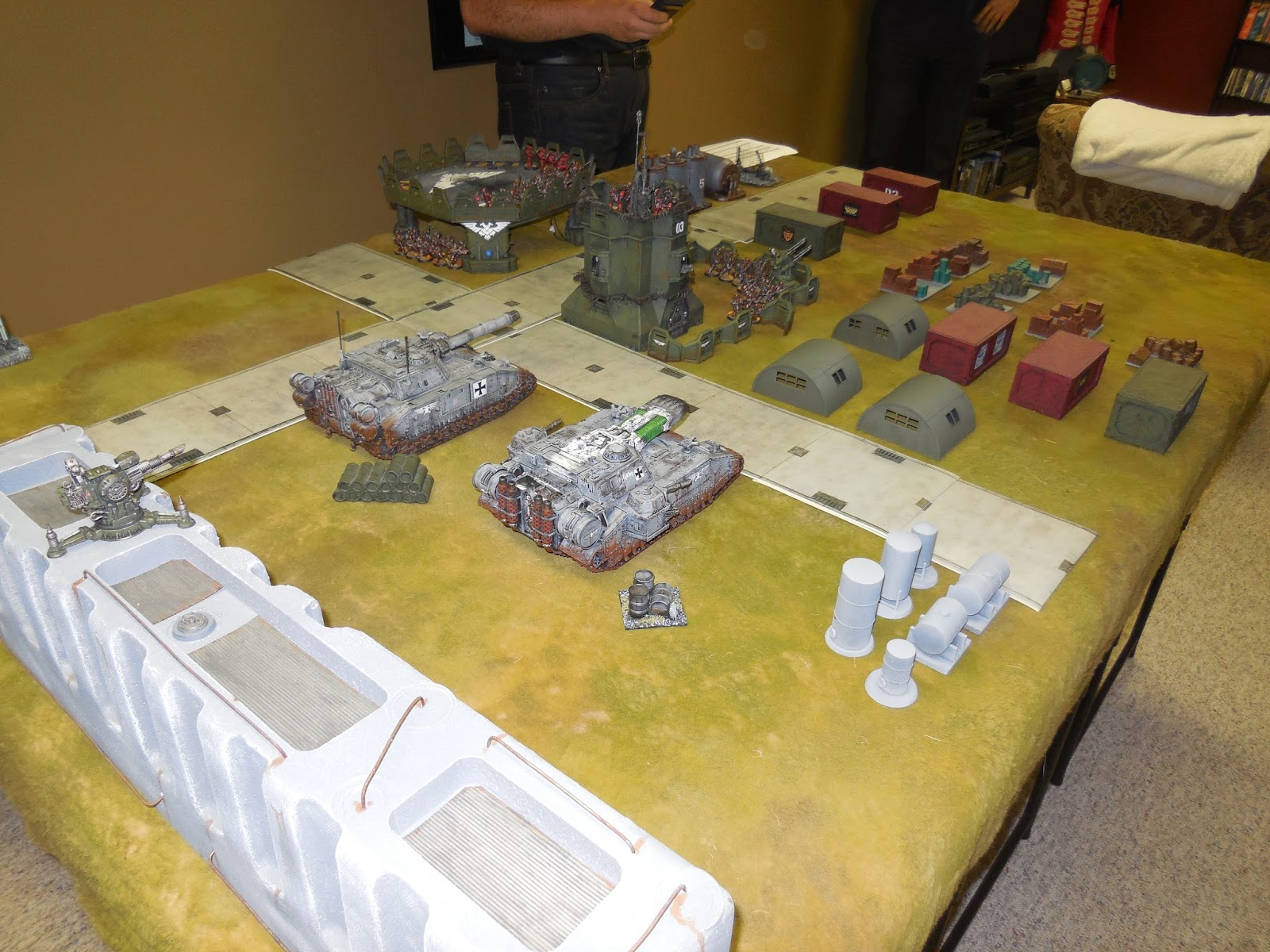 The battlefield represents a tactical staging area for the Orask planetary defense force/Solar Auxilia. The superheavy tanks are under repair and won't take part in the battle (tonight anyway). The Blood Drinkers and Solar Aux defenders were allowed to deploy in the Bastion (at centre) and behind the defence line around it, as well as in the area "south" and "west" of the roads (assuming that "north" is the short table edge at top right of picture).