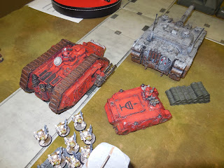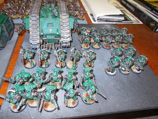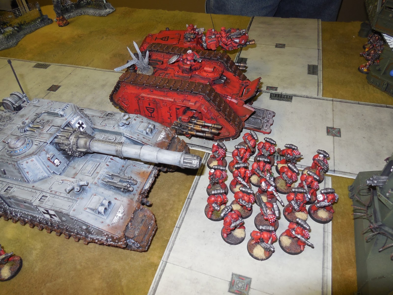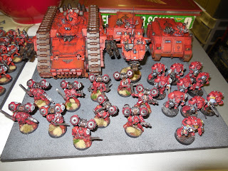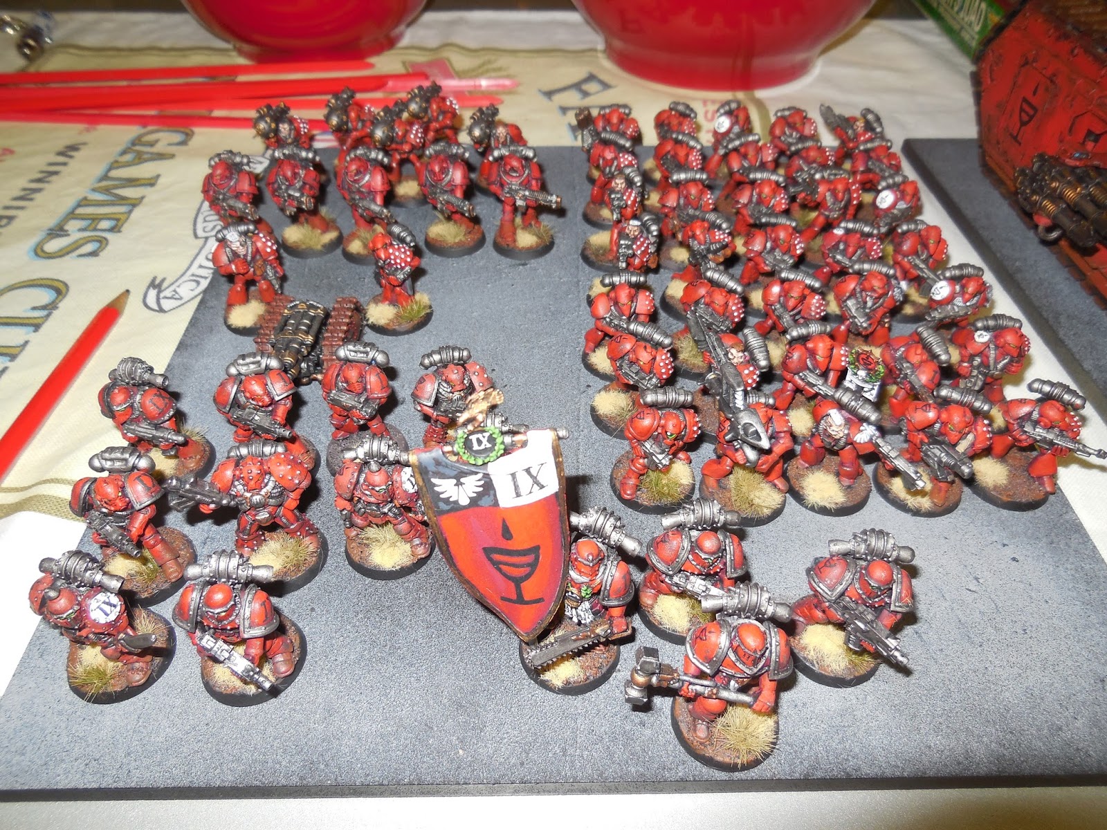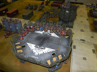 Here is the Blood Drinkers force. Praetor Draculis and command squad, Veterans to the left, Rapier behind just in front of the Tactical Support squad and the heavy weapons squad. Masses of Tactical Marines at right.
