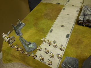 Solar Aux mobbed up on the top of the landing pad with excellent fields of fire over the approaches to the Bastion. Their comrades deployed behind the defense lines. The Blood Drinkers were allowed three infantry elements on table - the Tactical Support squad with Volkite Calivers on the landing pad, the Rapier carrier behind the storage tanks, and the plasma cannon squad on top of the Bastion.