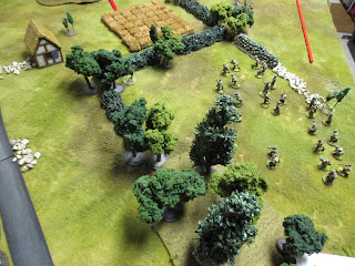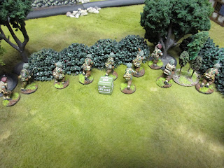 The Paras dash up to the edge of the bocage. To simulate the tough going, we ruled that bocage could only be crossed with an "Advance" order, after which a d6 is rolled. On a result of "1" the unit stops on the near side of the bocage; on a "2-5" they cross but stop on the other side; and on a "6" they move their full movement past if desired.