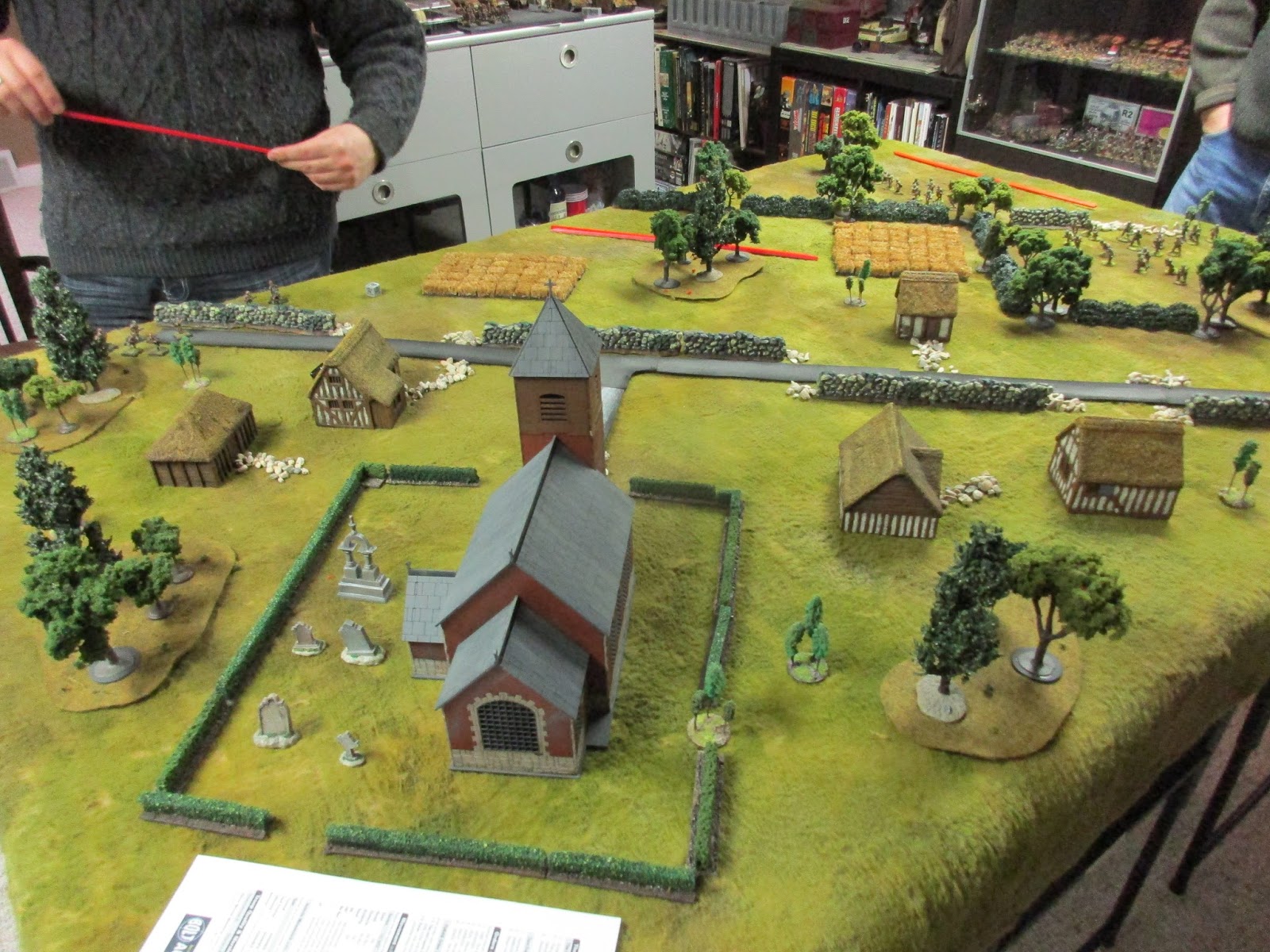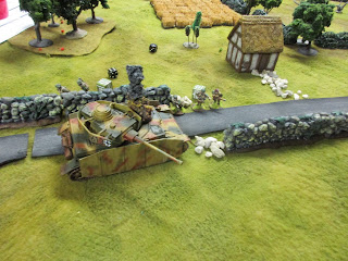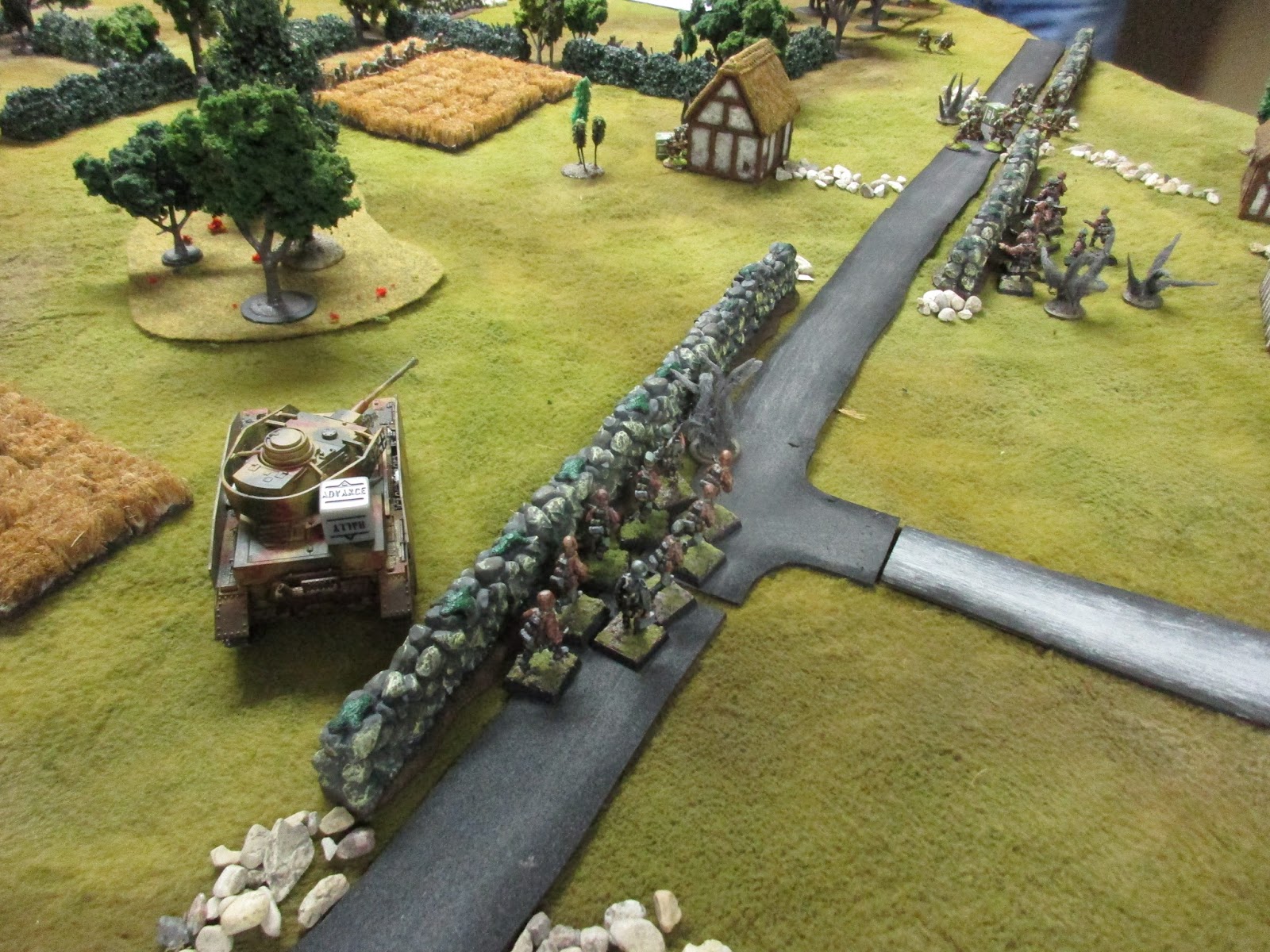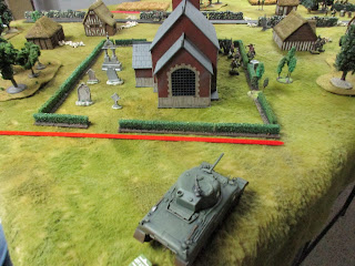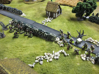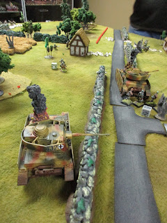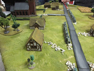 I set up some terrain and came up with a plausible-enough scenario: Brit Paras start at short table edge opposite the village, and have eight turns to get to the church, where they're supposed to link up with US armour. The German blocking forces come on from the long edges. Each side has three tanks (Shermans and Pkpfw IV(H)) which come on as reserves; the Germans on the road and the Shermans from the short edge behind the village.