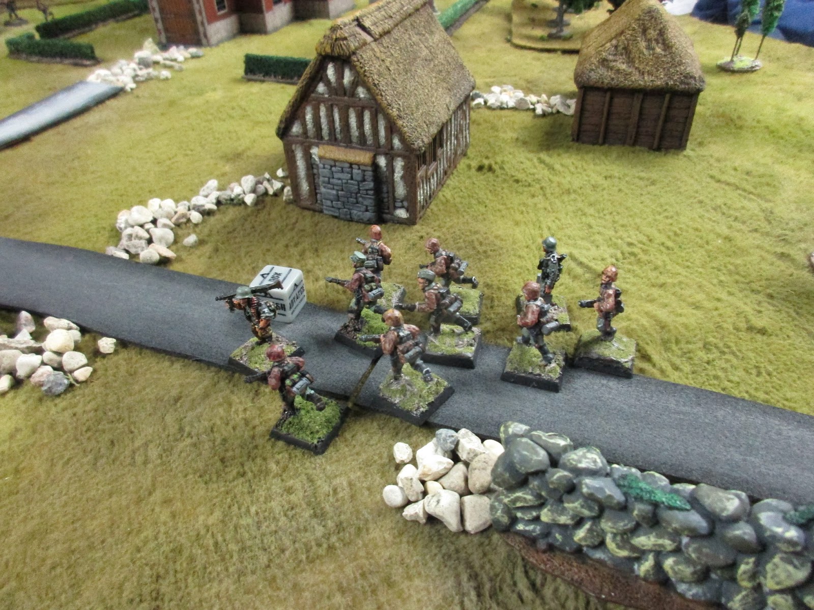 Waffen-SS infantry advance up the road, looking to head off the British.