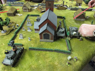 Sherman rolls up and pins down Germans lurking in the churchyard.