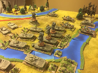 This was a fun game with lots of back and forth swings. At the beginning the Leopards rolled across lighting up BMPs and T-72s at will, but as the Soviets started to remount their vehicles but by mid-game the Soviets had awoken and were making things tough for the Bundeswehr. The last two turns in particular were a bit of a slog with every Soviet hit on a Leopard causing a distinct wince... Even one tank knocked out created significant problems in German morale - the two- and three-tank platoons are quite fragile!
