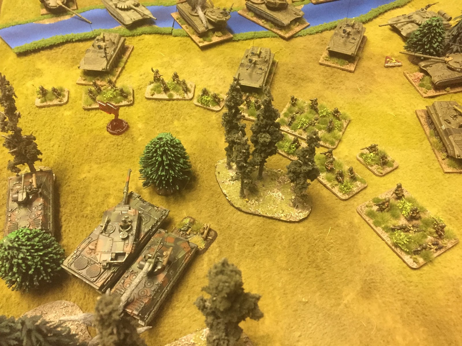 Soviet deployment. As noted, all vehicles are bailed except the Carnation SP guns at top left. Leopards have deployed at top right, headed straight at the Soviets.