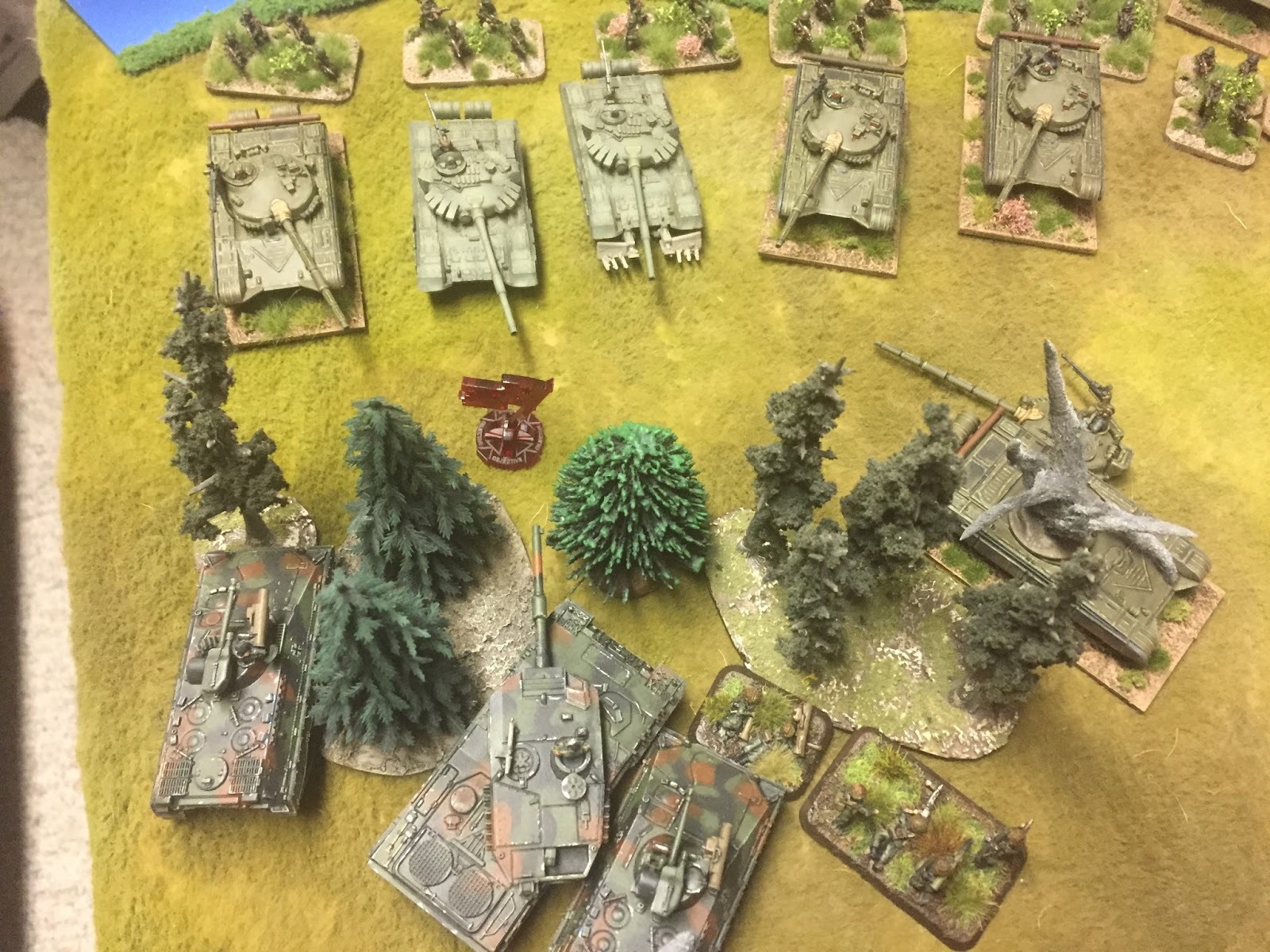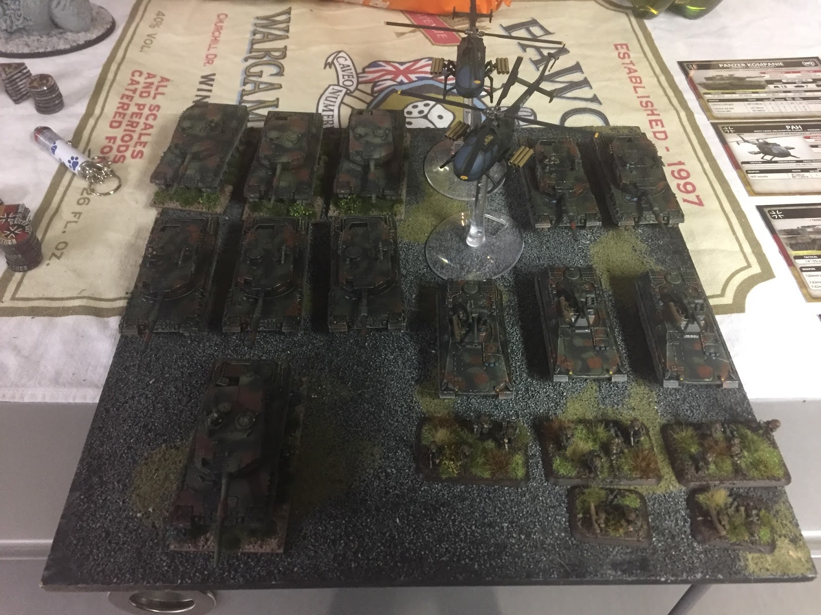 The West Germans - three Leopard platoons and HQ, Panzergrenadier platoon with three Marders, and two BO-105 attack helicopters.