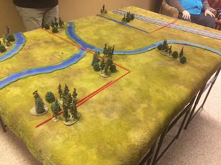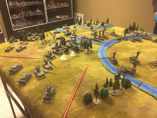 The scenario was called "Flanking Attack" and involved the Germans catching a Soviet battalion mostly unaware, laagered in the box at centre-upper left. The German objective was to hold one of the two markers - one just visible above the trees at centre left, the other in the treeline at top left. The Germans deploy in the box at top centre right, with reserves coming on the table at bottom centre of photo, along the long edge.
