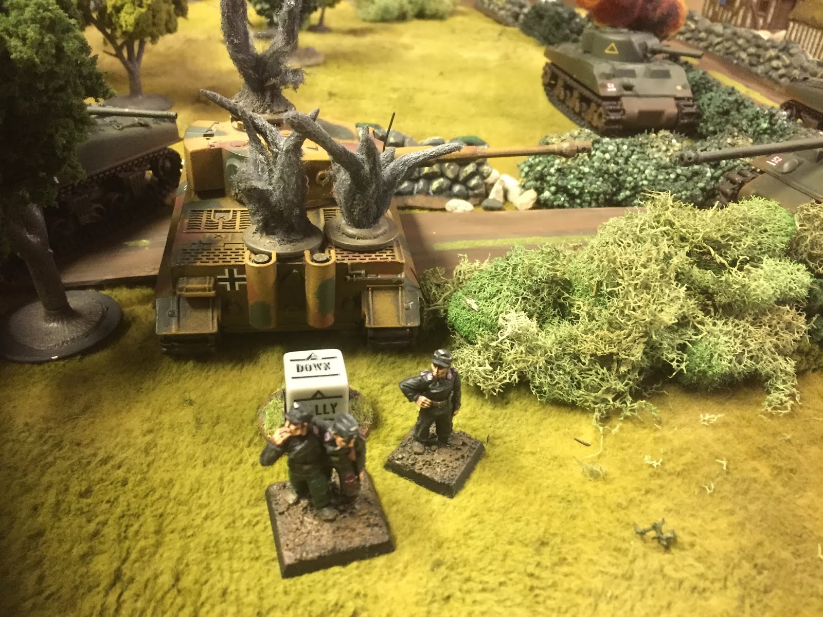The Germans struck back quickly though as the Tiger potted a Sherman (top left). The Sherman at bottom right crashed through the bocage hedge straight into a German minefield... which caused no damage, thanks to typical Sean die-rolling.