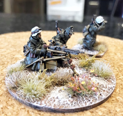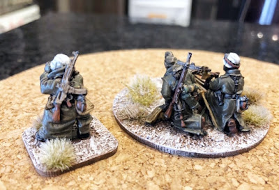 I believe the three figures on this weapon crew were meant to be crowded together on to one larger base, and I was planning to do that at the outset...but the only way to do that, it turned out, was to have the officer right in the path of what I would assume to be a stream of empty casings flying from the MG-42. That seemed wrong to me. I also remembered that games like "Chain of Command" will, at times, have a weapon team like this under the direction of a junior leader. So I popped the gun commander onto a separate square base I use to mark NCOs/Junior Leaders, and left the two-man team directly with the gun on the larger round base.