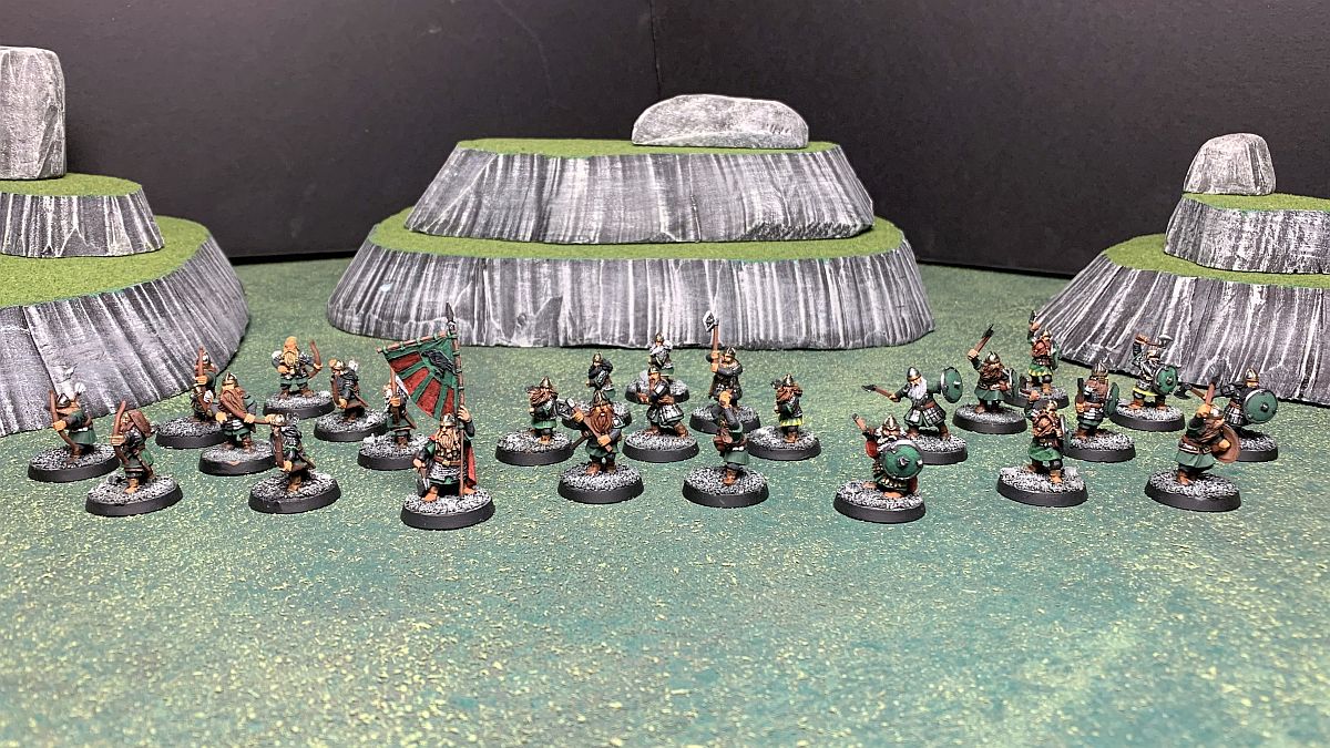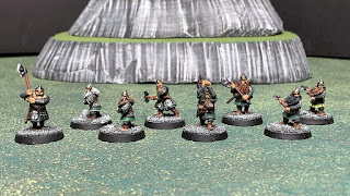Having completed all my Middle-earth Dwarf heroes, it was time to move on to some rank and file of Durin's Folk and put together a company consisting of a Dwarf captain, a standard bearer, and 24 Dwarves - 8 with hand axe and shield, 8 with two-handed axe, and 8 with Dwarf bow.
