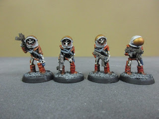 Well how about this for something different! Skeletons in spacesuits! These are the product of talented digital sculptor "BigMrTong", nom de guerre of Mike Tongue out of the UK. I was poking around on Etsy one day (as you do) and spotted these - wow! What an awesome Rogue Trader vibe they have, as you'll see...I ordered all of the variants available. This clearly is the former captain of whatever doomed spaceship these guys crewed, and two bodyguards equipped with giant-f***-off spanners.Note that they are equipped with boltguns straight from the RTB01 Space Marine sprue, I love that!My painting inspiration for these was the ACES suit - that stands for "Advanced Crew Escape Suit". It's a full-pressure suit worn for ascent and descent of the space shuttle, but it's not intended for extra-vehicular activity (EVA). The point of the ACES is to keep crew safe in the event of sudden decompression of the spacecraft.So unlike EVA suits, the ACES is "International Orange" in colour - the idea being to aid visibility if the crew have to be recovered from water or light-coloured terrain.The models have lots of detail, including some cool-looking tanks and hoses. I prepped the models with allover Celestra Grey, then Corax White. After that I painted the suit bits Army Painter Speedpaint "Fire Giant Orange", then painted the tanks The Fang (ugh) highlighted Thunderhawk Blue and Russ Grey. The hoses were washed with Nuln Oil and Drukhari Nightshade. The skellie parts were washed Agrax Earthshade and highlighted Pallid Wych Flesh, and the helmet interiors were washed with some old Chestnut Ink I had around. Boltguns are Leadbelcher washed with Nuln Oil of course.They pair pretty well with old Space Marines don't they! I can see using these guys in a skirmish game (Kill Team?) using Space Hulk boards, they'd fit that vibe really well. Maybe half a dozen Space Marines against 12 or 15 of these dudes.
