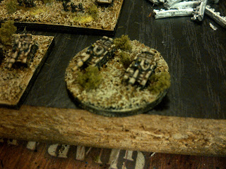 There are certainly times when armoured vehicles mass on the battlefield, but generally they are quite spread out. How to get this on a reasonable sized table, while still playing with a ton of tanks?  I started to experiment with individual basing for the 3mm stuff last summer - example here.  Recently I finished another round of the figures, and re-based some of my previous stuff on individual bases, enough to get tonight's game going.
