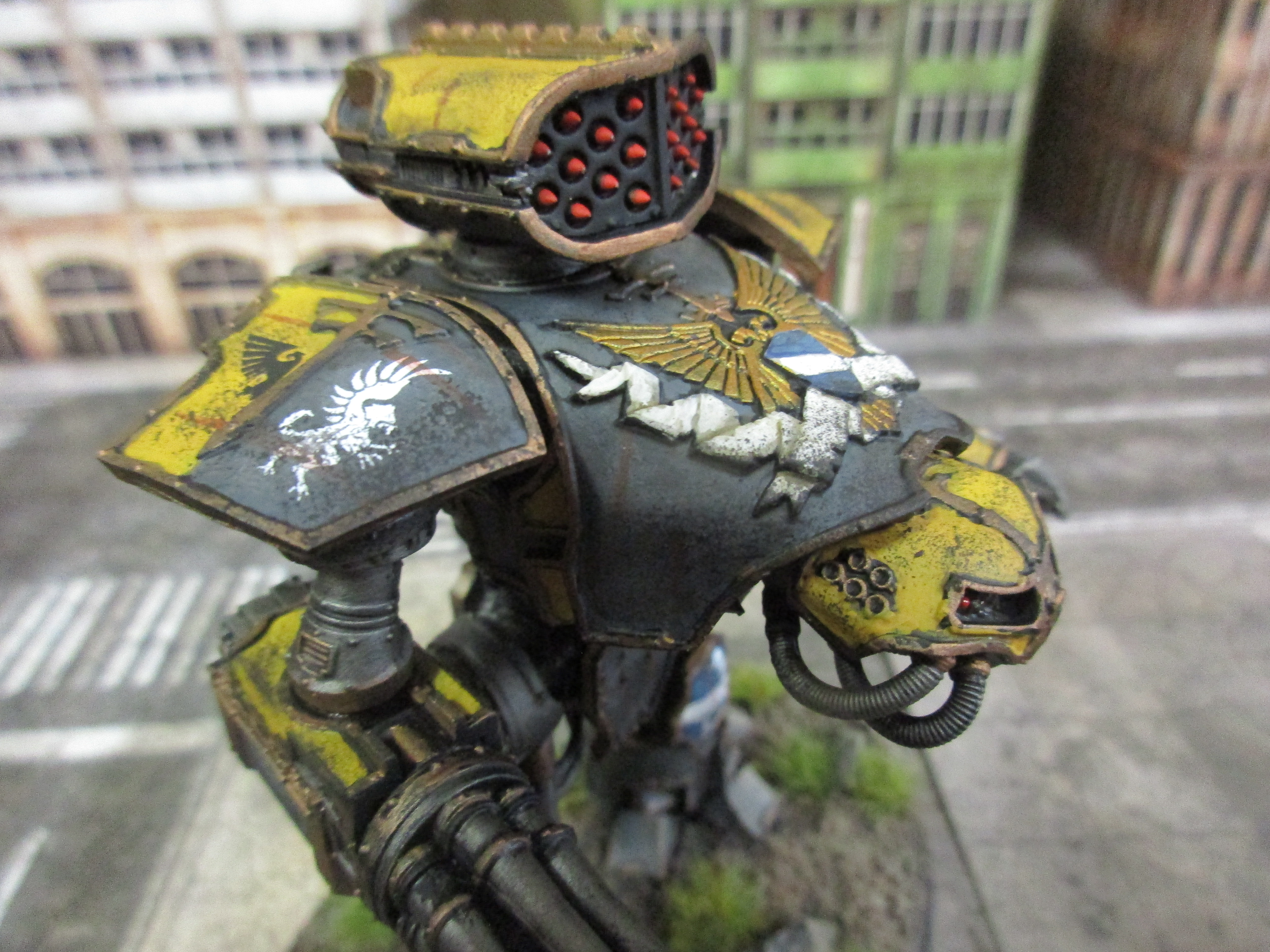 But wait - there's more! I painted all of the weapon options for the Reaver and magnetized them for easy swapping - here the God-machine is seen equipped with a Gatling Blaster, power fist, and carapace-mounted Apocalypse Missile Launcher. And a different head, to boot.