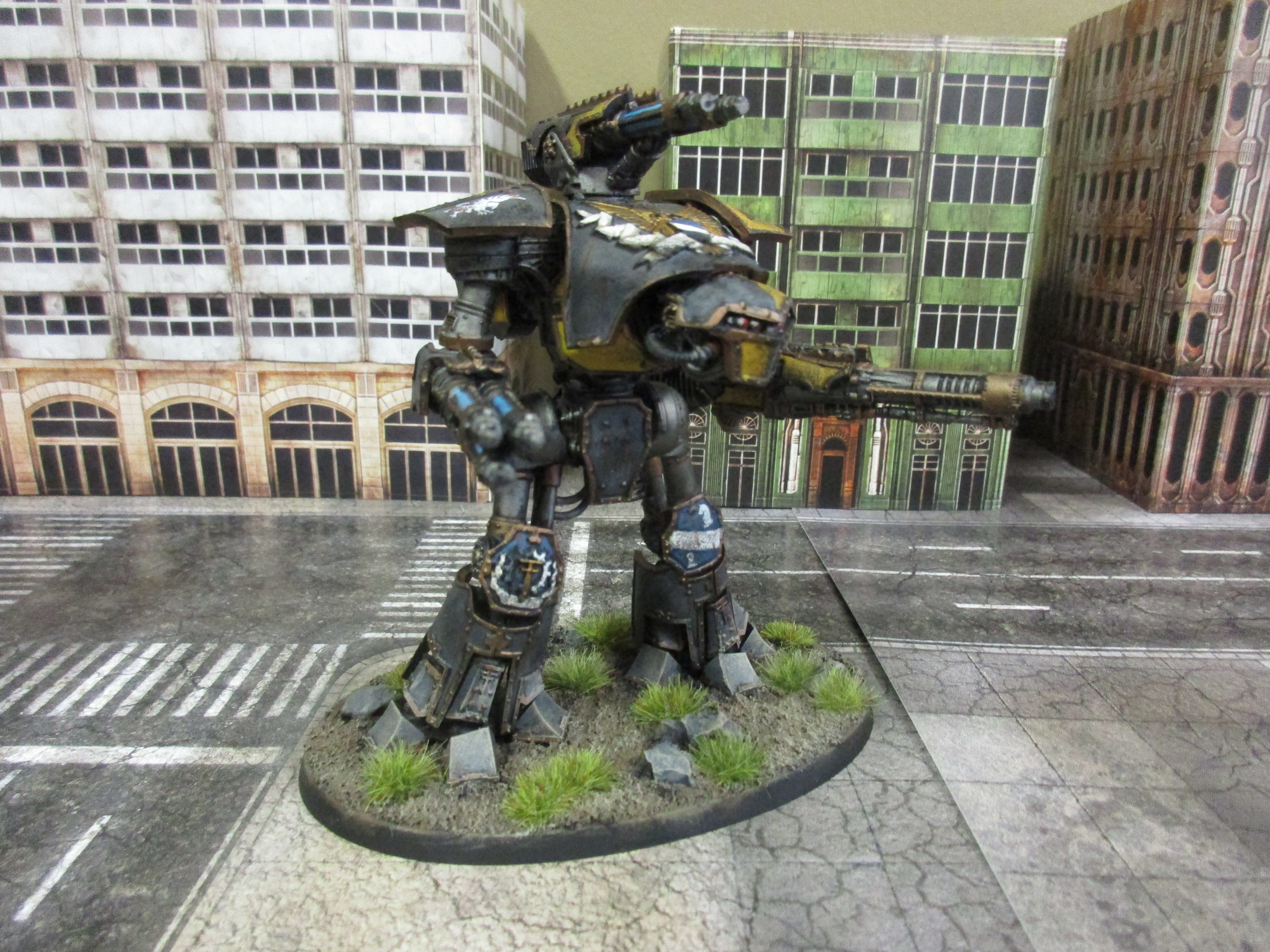 I've been a bit remiss in posting here as I've been madly painting in the Analogue Hobbies Painting Challenge. As the Challenge has ended, now it's time to play some catch-up and repost a few models here on our home blog. This is the Legio Gryphonicus Reaver Titan I painted for the "Altar of the Snowlord" - the final room of the Chambers of Challenge.