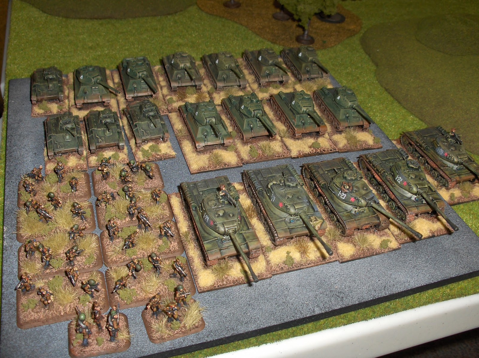 I have the attention span of a gnat.  Anyway, while I did this other stuff, six T-55s were sitting on the painting table with a base coat of paint. After weeks of passing over them I finally snapped and finished them off this week.  So here is a completed T-55 company, nine tanks strong.