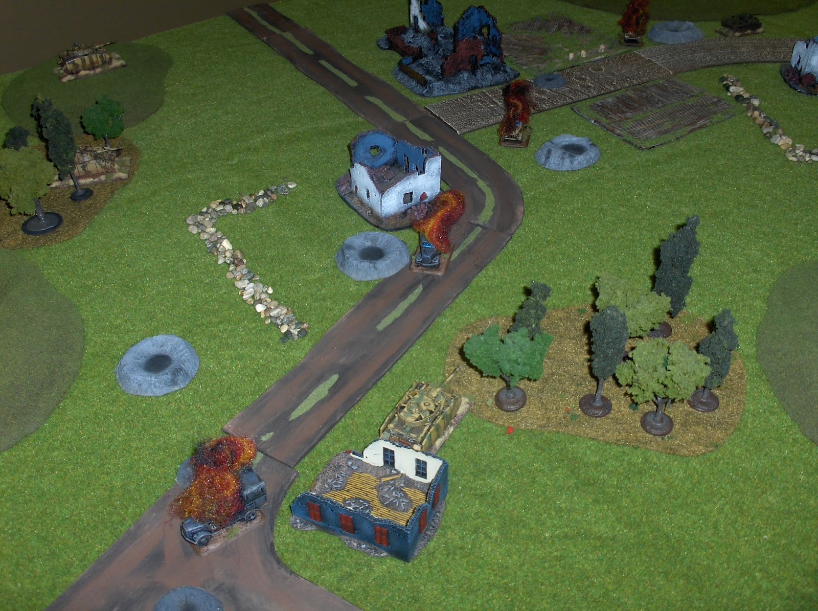 For this game there were a few modifications - I ignored a lot of the army list restrictions, I used my own scenario rules instead of one from the rule book, I ignored nearly all of the special rules, and I stipulated that the tanks could be no closer than 4" to another tank that wasn't burning.  I also ignored the chain of command restrictions for the tank units, so they could spread out.