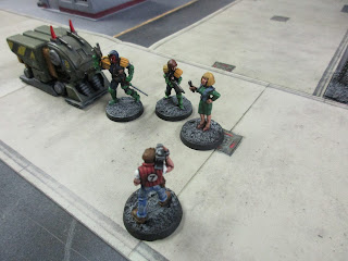 Here's the 4x4 table set up for the game. The story: Jane Goodall Block Citi-Def has been running an armed exercise in an industrial area of the city bottom, and complaints about gunfire and general arsing-about have been received by the Justice Department. As the JGCD has previously been warned, this incident has escalated to Judge intervention and a Pat-Wagon was dispatched with Judges Fraser (a Veteran Street Judge) and Gregg (a rookie Judge) aboard.