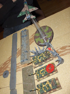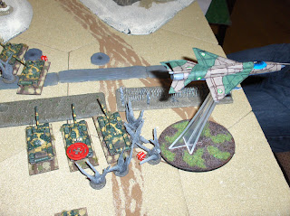 ...the air force showed up! The rules require a "Scottish check" when air assets arrive. If you roll a "1" then the pilot is confused and "blue on blue" is the result - your opponent picks the target of the airstrike and it is resolved against your own troops! Of course, that's what happened, and the MiG attacked our own tank platoon, doing three Pins and halting their advance.