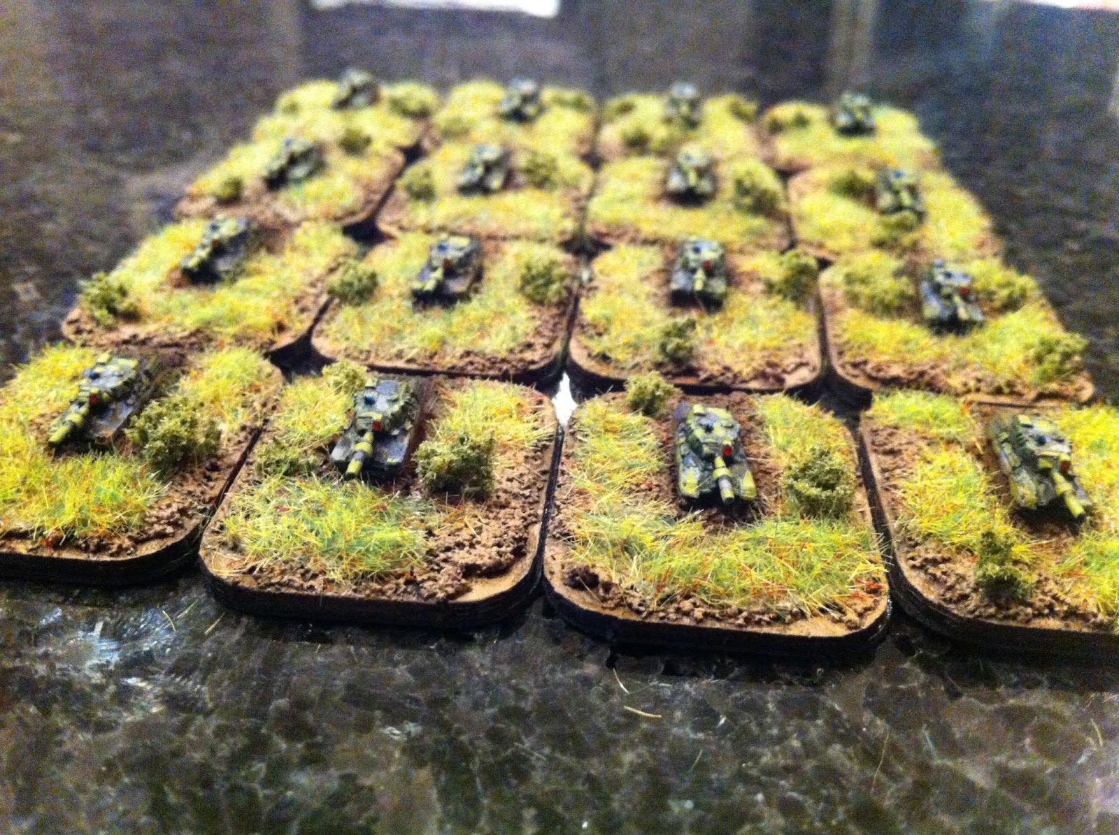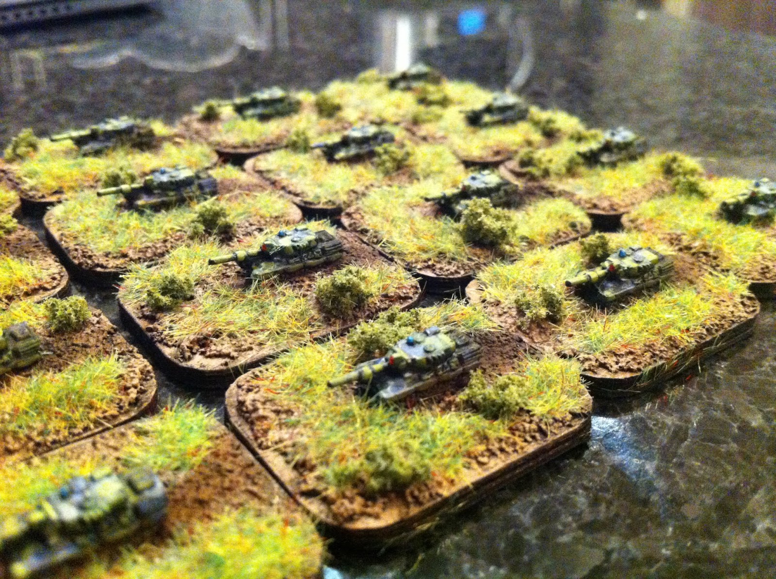 When I had first purchased these figures I based them in groups, so each stand would literally represent a platoon. But the look still didn't quite work for me - I have always loved tons of tanks on the gaming table, but disliked the "hub to hub" effect this produced in terms of the look.  This happens even with the smaller size figures like 15mm (for examples, see nearly any Flames of War game).