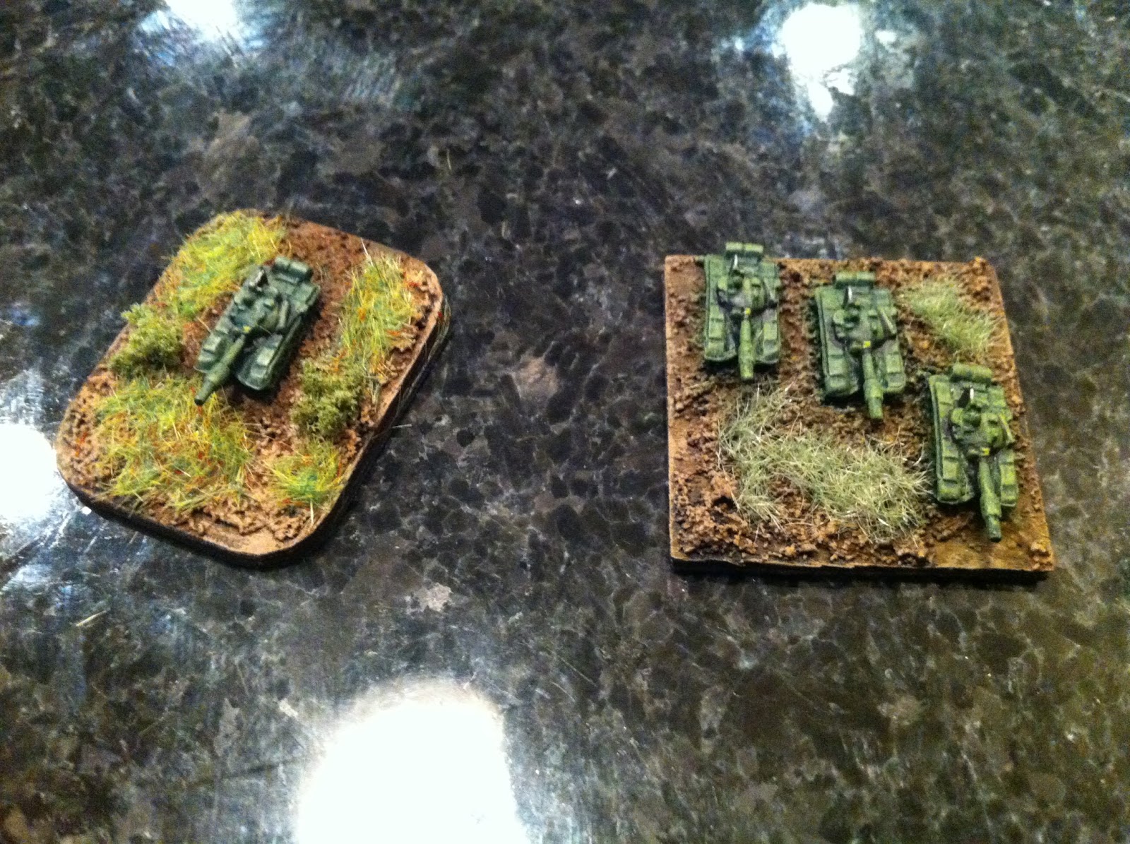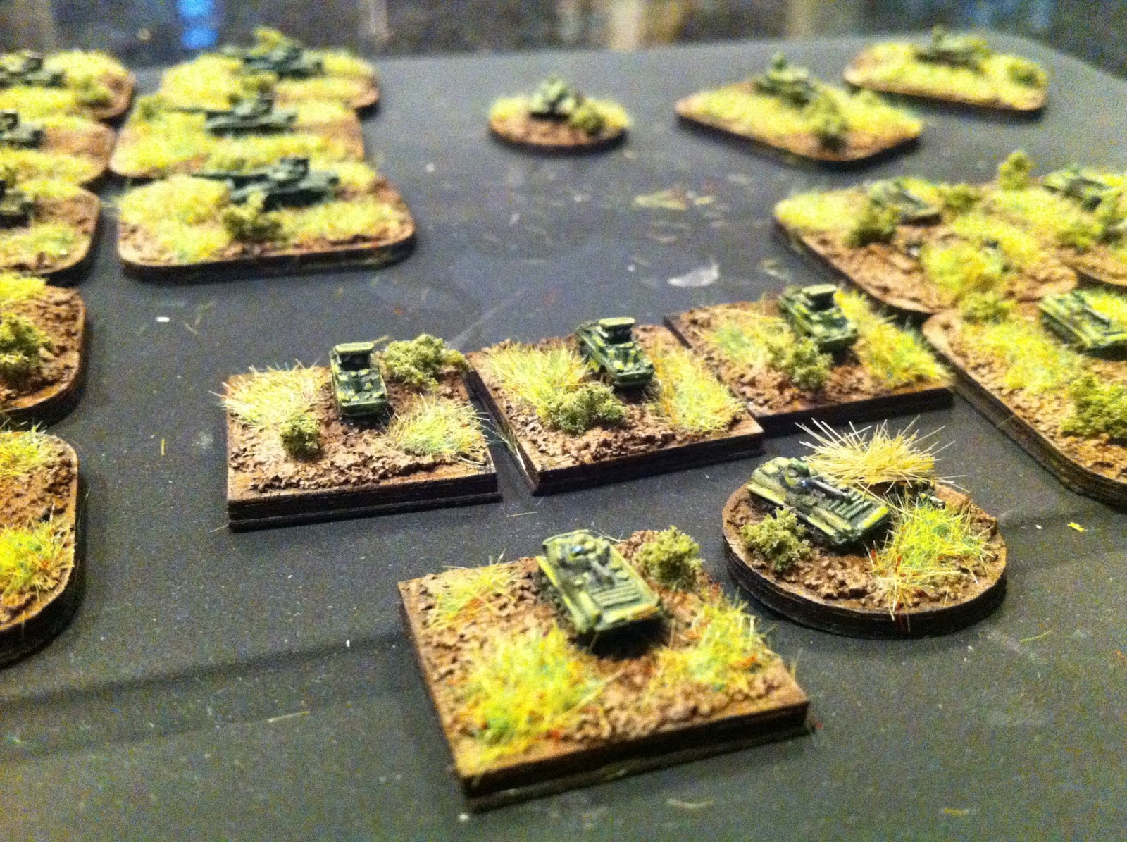 There are certainly times when armoured vehicles mass on the battlefield, but generally they are quite spread out. How to get this on a reasonable sized table, while still playing with a ton of tanks?  I started to experiment with individual basing for the 3mm stuff last summer - example here.  Recently I finished another round of the figures, and re-based some of my previous stuff on individual bases, enough to get tonight's game going.