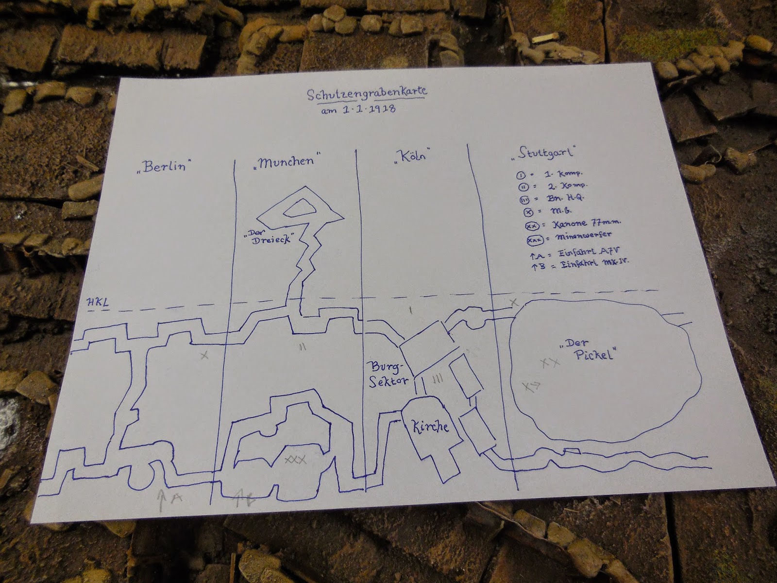 Here's the ground to be fought over. I'm reminded of that scene in "Blackadder" where General Melchett tries to cheer up George by showing him a sand table at his HQ representing the ground captured in the last advance... George asks what scale it is and Melchett replies, "it's actual size."