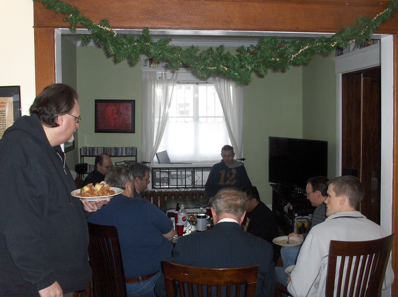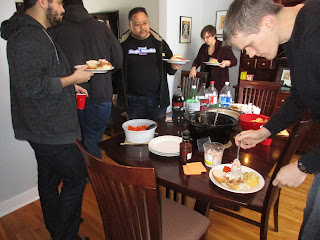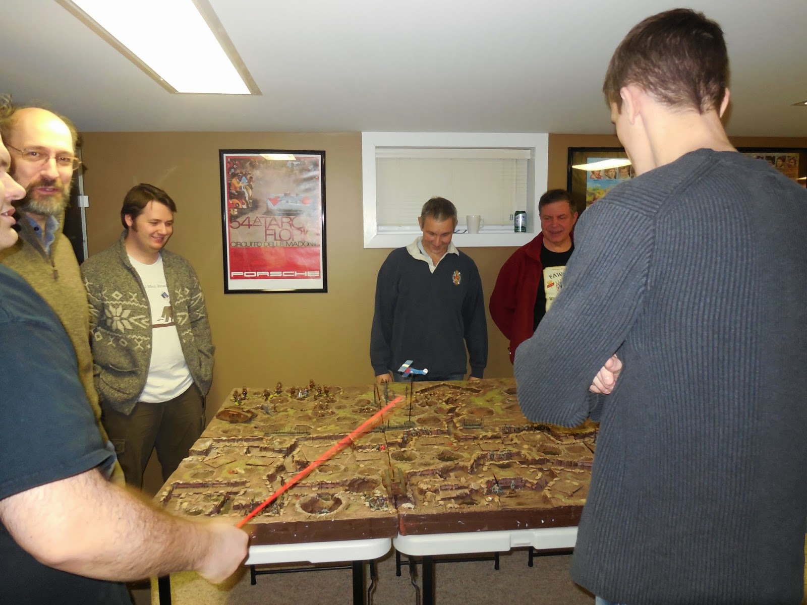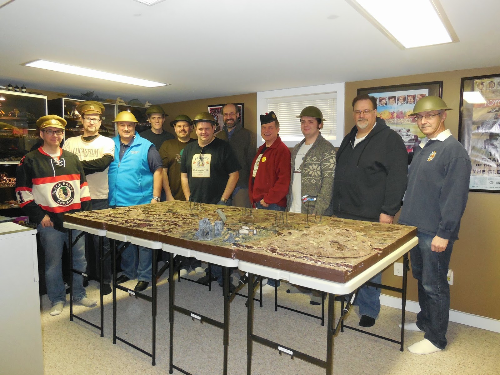 Yesterday, I hosted the annual New Year's Day Game and Lunch Extravaganza. We had a great turnout of Conscripts for the lunch and game - from left to right - yours truly, Conscripts John, Bill, Mike F., Byron, Greg, Brian, Frederick, Keegan, Kevin, and Hugh. Since the game will be set in the Great War, we're outfitted for the photo with some appropriate period headgear courtesy mostly of Conscript Frederick.