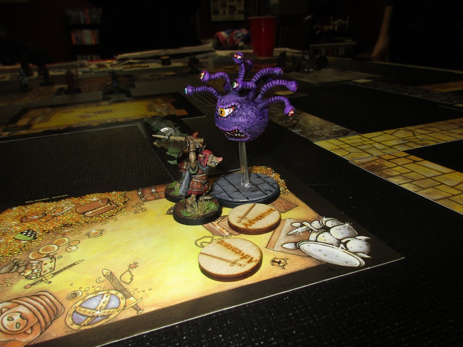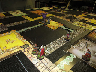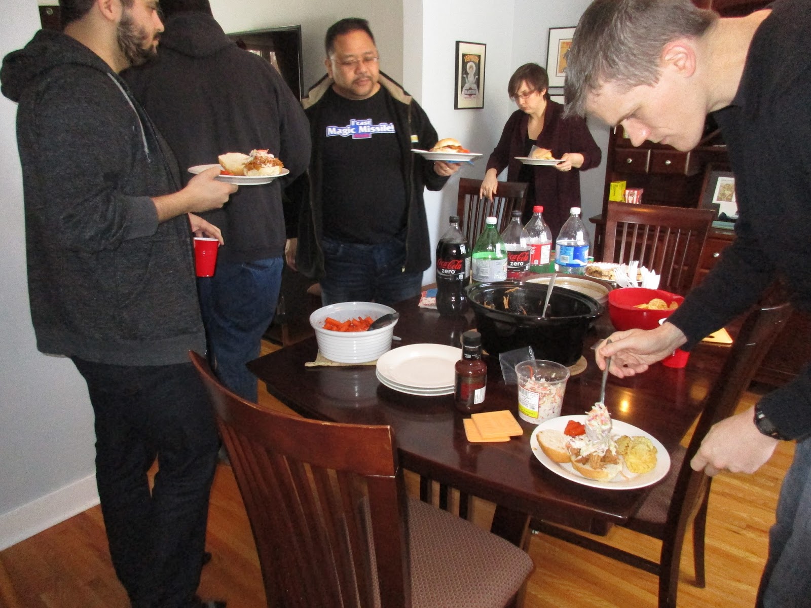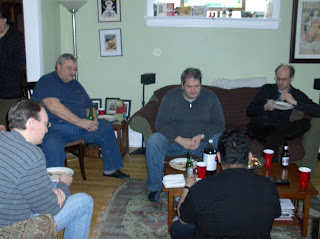Of course, before the game we have to eat... Pam laid on a very nice spread of pork-and-apple pie, yam fries with cinnamon, and an orange vinaigrette salad. Carrot cake and dainties for dessert, too (thanks to Conscript Byron for the latter), with everything washed down with soda, and Rolling Rock beer courtesy of Conscript Mike.