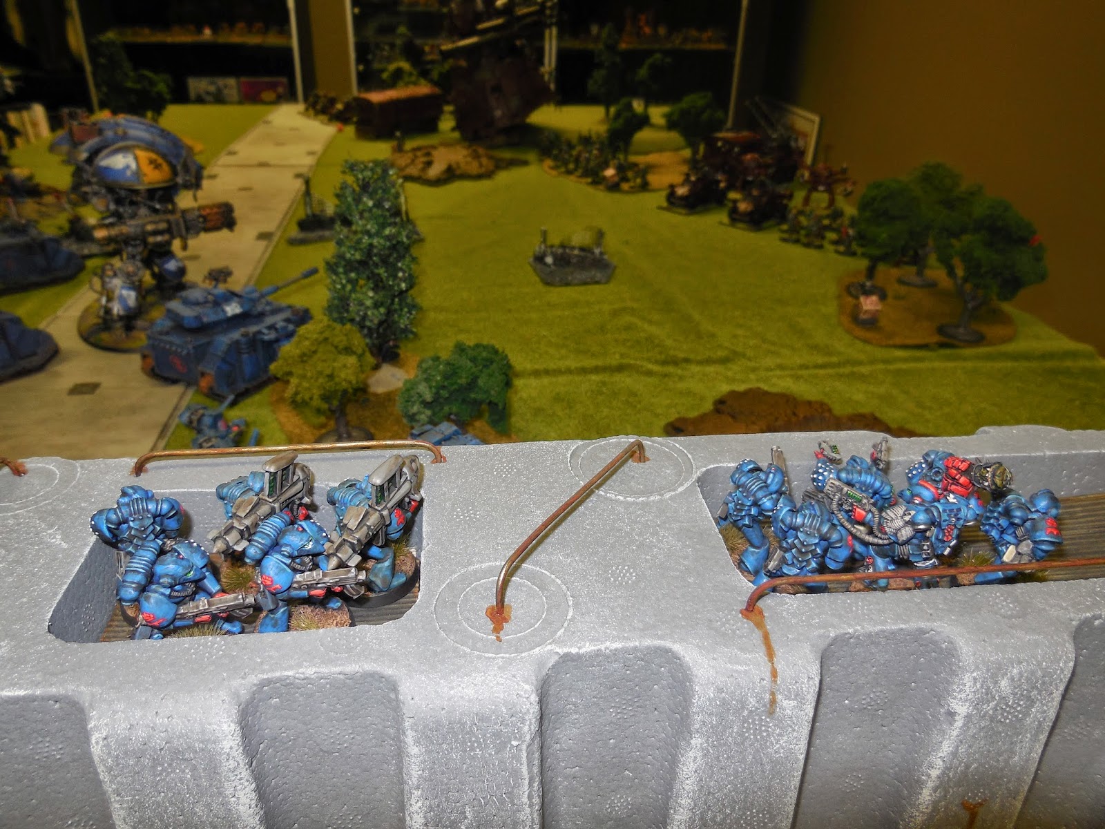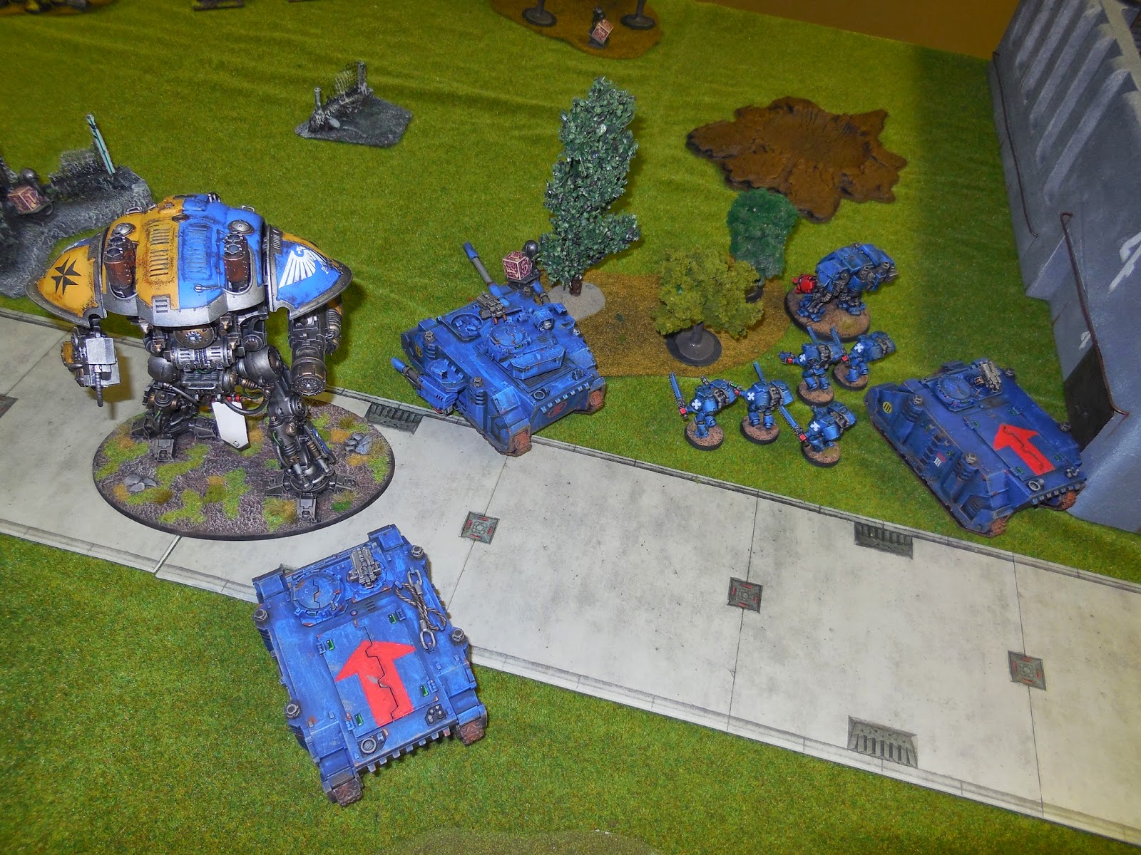 The Imperials came out with three squads of Marines in Rhinos, a Predator, a Devastator squad, a Terminator squad, Scouts, an Assault squad, and Pedro. Plus two Imperial Knights -