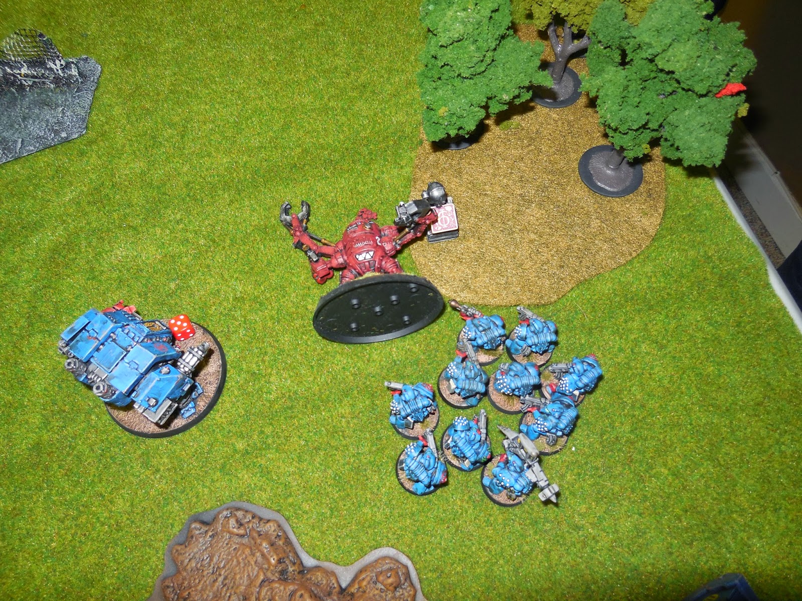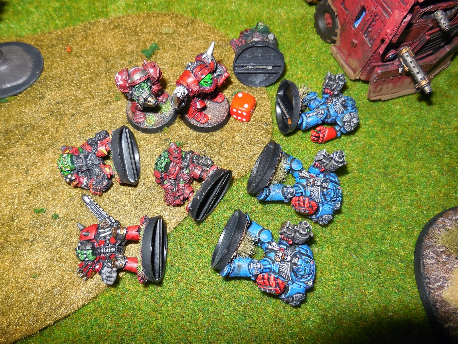 Over on the other flank, things aren't going that well. The Deff Dread charges in only to be felled by Marine krak grenades before it can swing a power klaw.