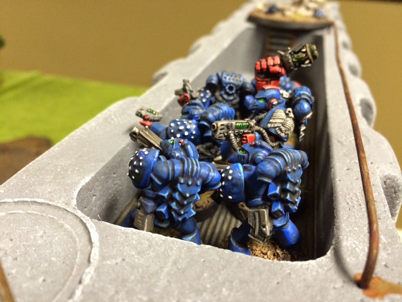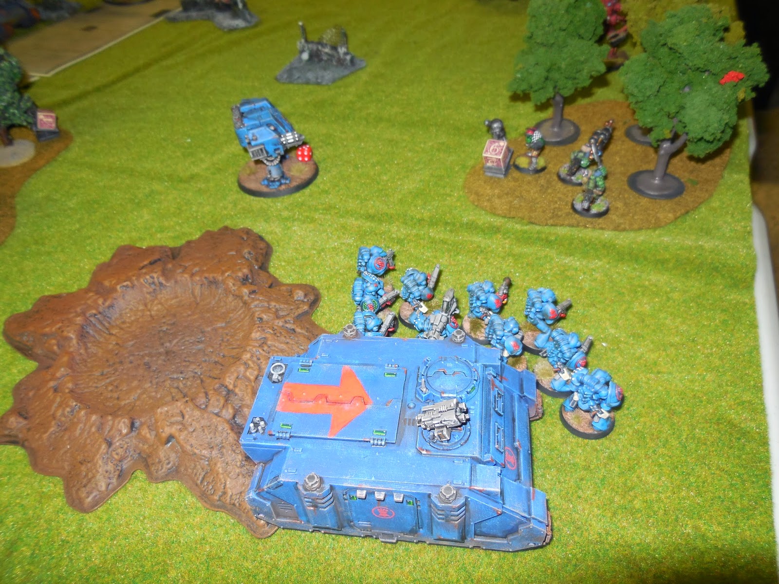 After whittling down the Kommandos with Devastator fire, the Marines disembark to prepare for the assault. Dreadnought has had its powerfist knocked out.