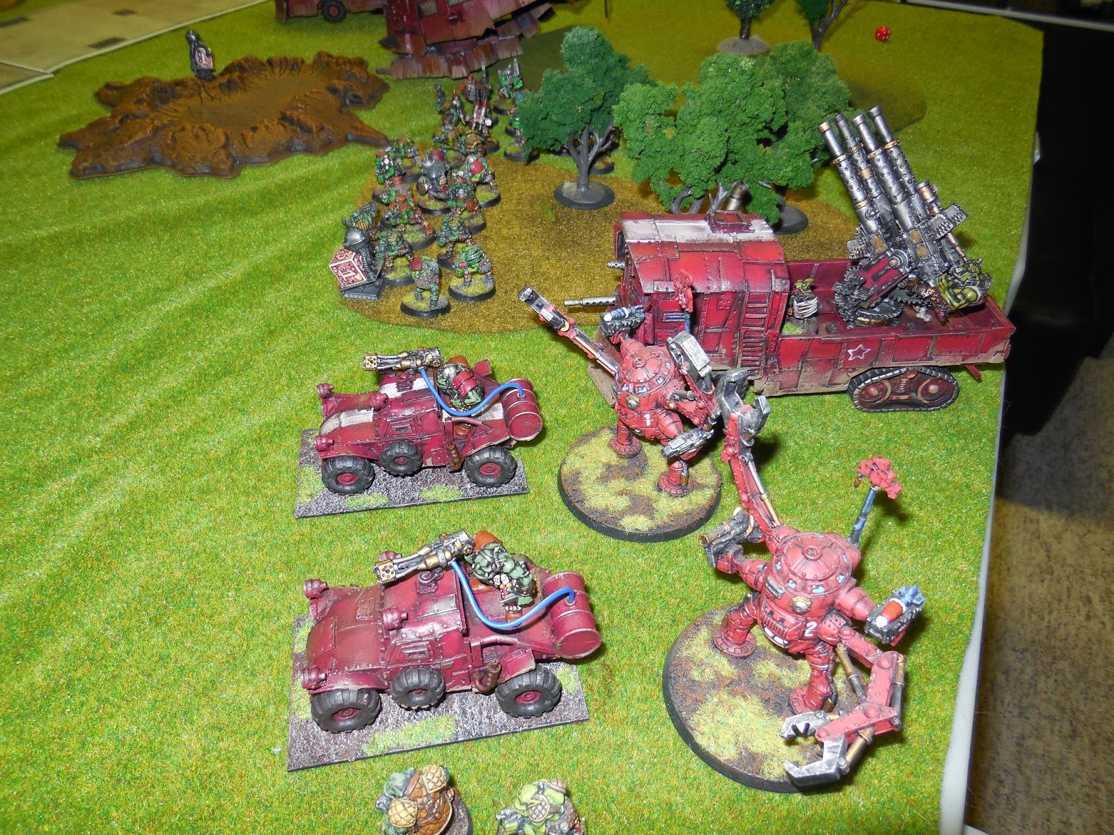 The Orks fielded, in no particular order: two squadrons of two and three warbuggies; two Deff Dreads, a Flakka Dakka wagon; three mobs of 15 Boyz; a unit of 5 Kommandos; a Battlewagon with Killkannon, a unit of 10 Stormboyz, and finally, Thrugg himself in mega-armor with 5 mega-armored henchmen. Oh, and the Stompa.
