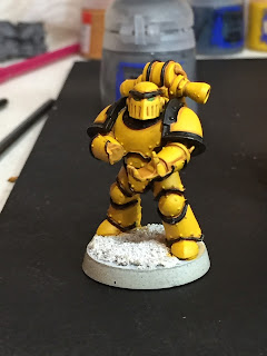 This was supposed to be the start of a new project, but I've been seduced by 30k. Seeing Greg and Dallas assemble MK III models from the Prospero box (Greg should be receiving commission by now) I ordered a bunch of stuff from Ebay and decided to jump in. Ever resistant to change and preferring the status quo, I've opted for Imperial Fists. I figured another Loyalist Legion was needed and they would complement the Blood Drinkers Dallas has painted up for what may one day be a Battle of Terra game. Below is an unfinished test model.