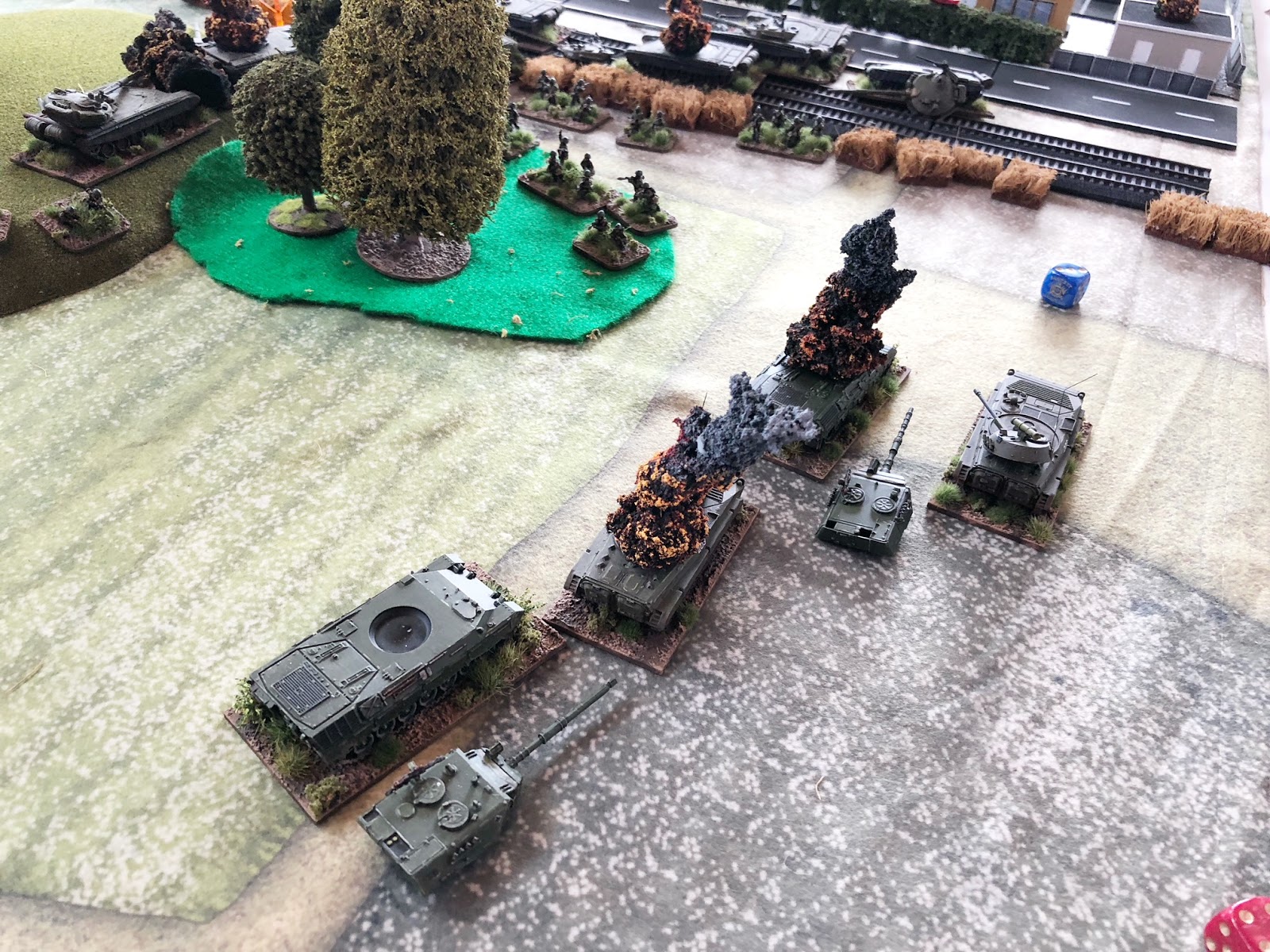 Since the theme for Prairiecon 2018 was "It's a trap!", I set up the scenario with some mild deception.  The Soviet players, controlling a T-72 battalion with some attached infantry and AAA support, were told they needed to clear the village of Blickheim (home, naturally, to a critical 'McPizza King' location) of a lingering Canadian rear-guard, that the NATO forces were in retreat.  They would have eight turns to accomplish this.