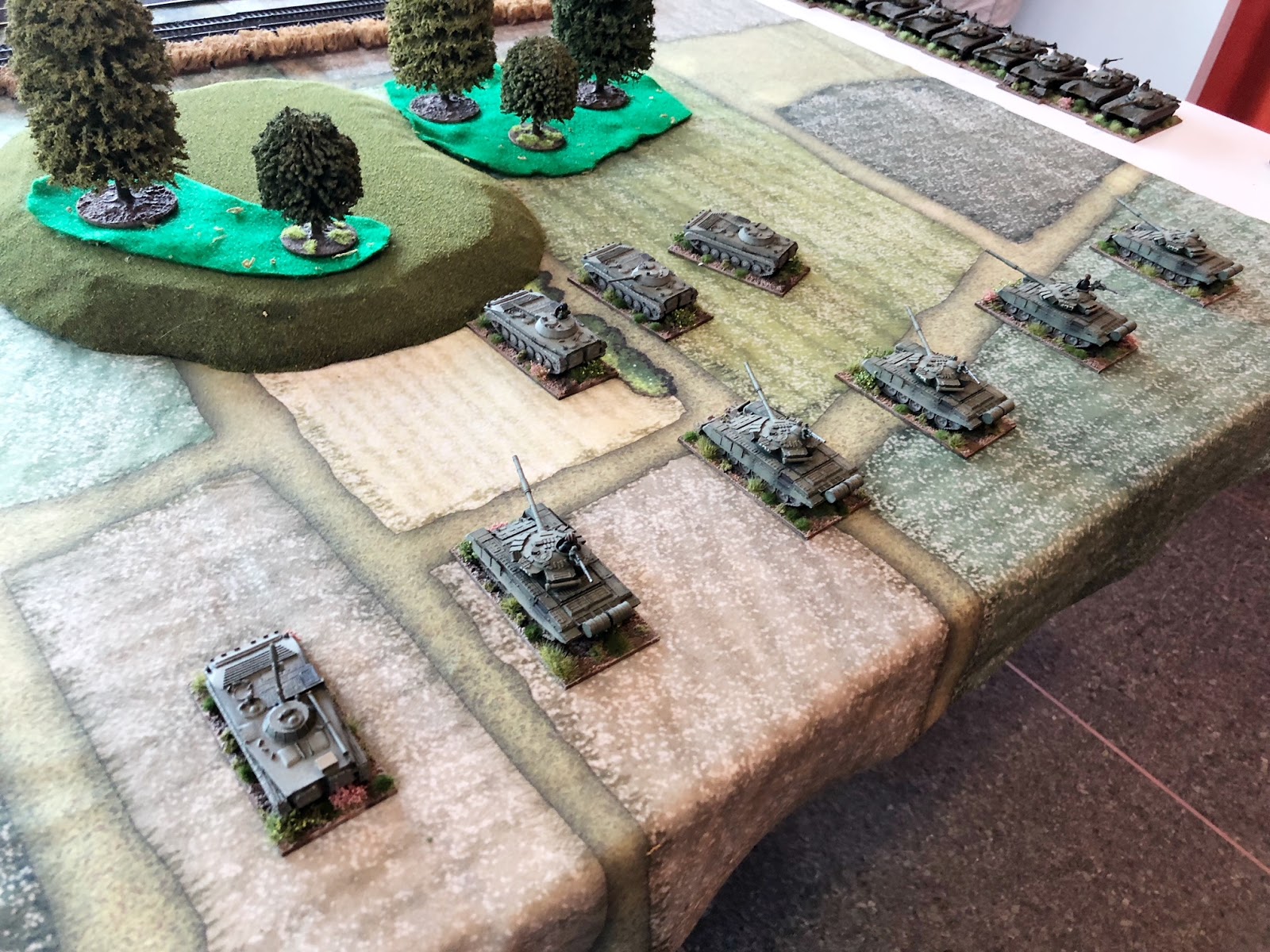 The Canadians, on the other hand, learned they had the opportunity to arrive from a totally unexpected table edge at a turn of their choosing - they have been working themselves into position through the late hours of the evening and into the morning, with the Soviet forces unaware their flank was vulnerable. This was a great advantage - which the Canadians would need, as the Leopard C1 tanks do not dominate the tabletop the way other modern NATO MBTs would in games of "Team Yankee".