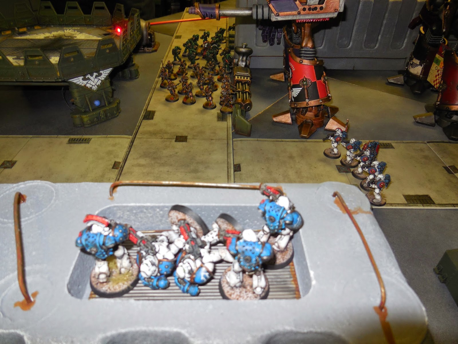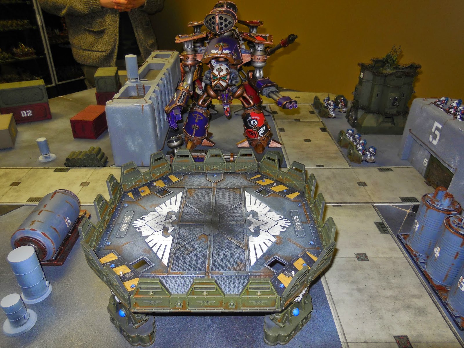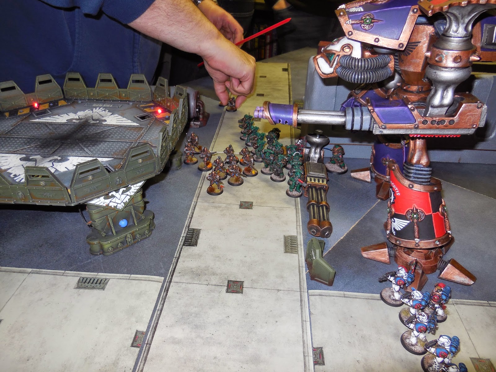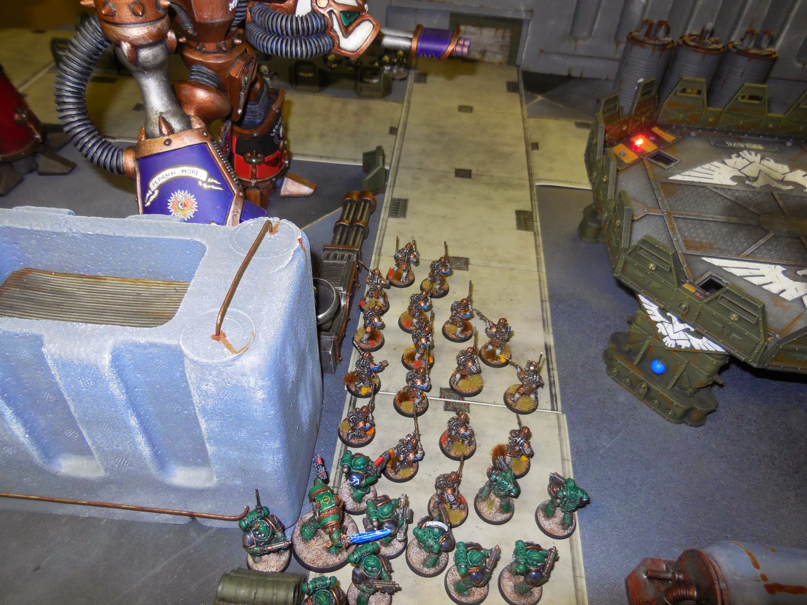 A great opportunity to use some massive terrain pieces - the styro-crete walls, Imperial Bastion, Aegis Defence Line and Skyshield LED pad were all deployed. Plus of course the Titans!