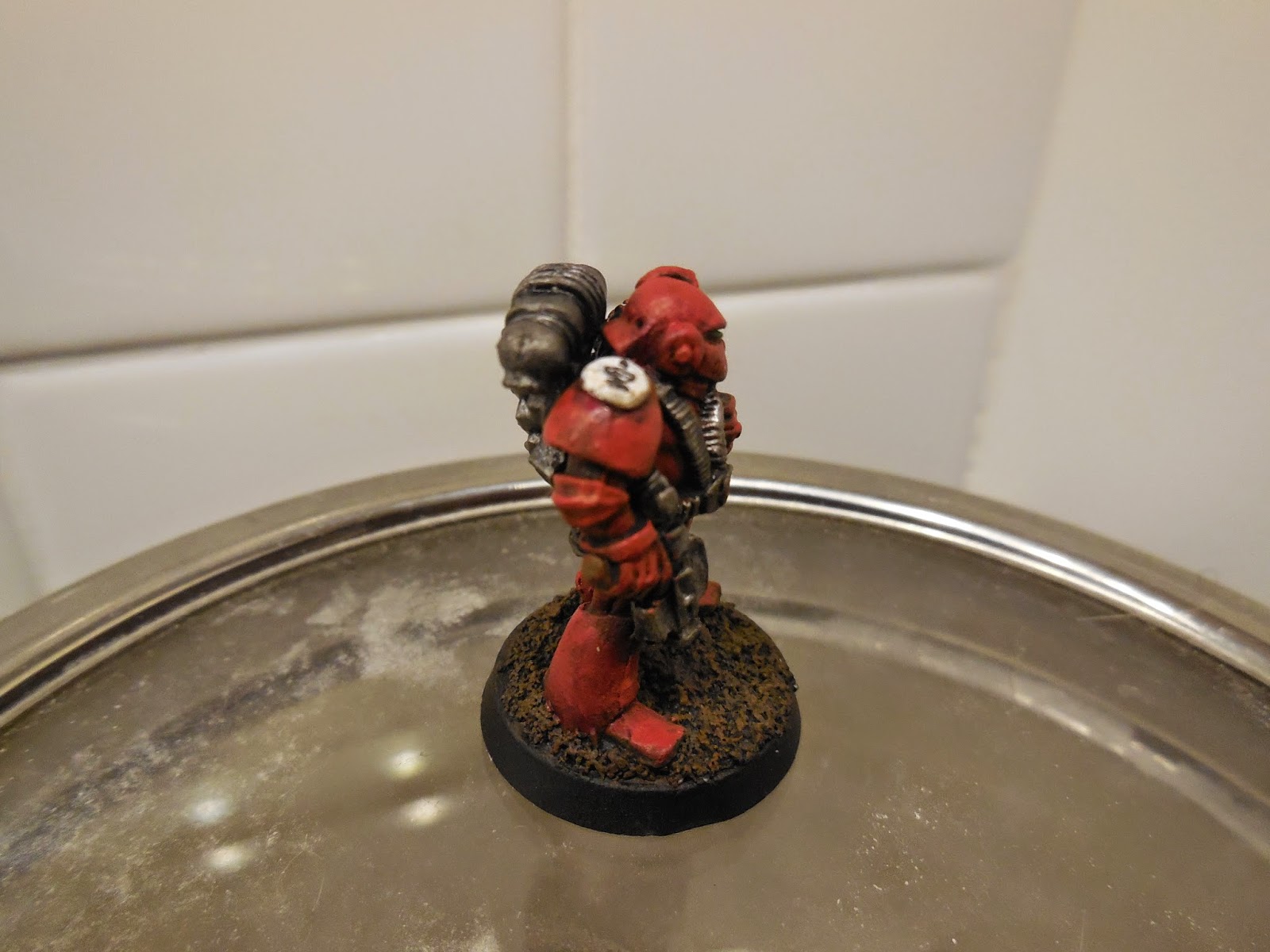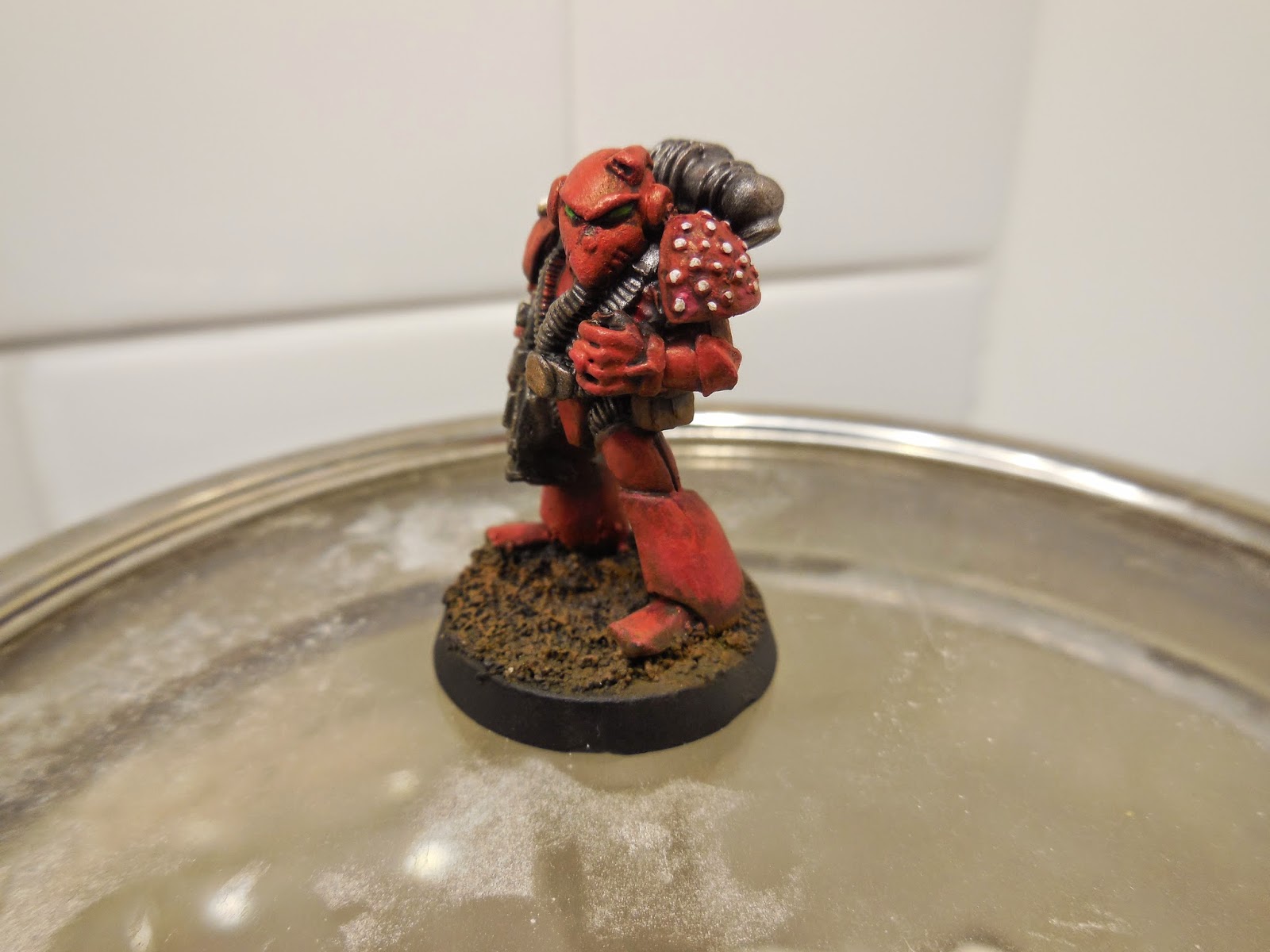 I really love the work the guys have done in weathering their Heresy Marines with sponge chipping, and I tried it a bit on this model, but ended up reversing it. Somehow it doesn't seem to fit the sculpting style of the old RT models. I used some powder instead and the effect is very subtle, but characterful I think.