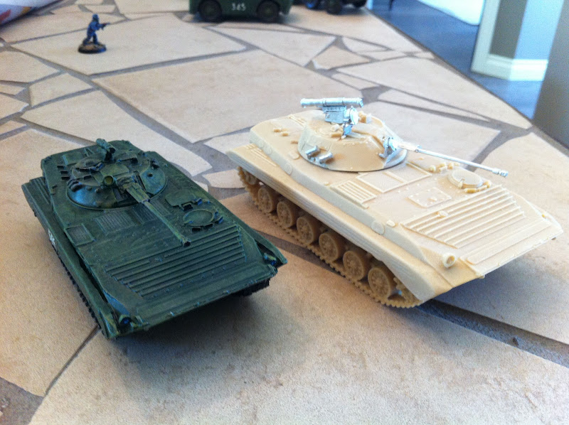 1/43 scale on the other hand looks fine for the tanks - but then I am basing this on a Kitech kit - who knows how close to "correct" the overall model is, and what scale it really is. But I can't have my Russian infantry ride in 1/56 BMP-2s with 1/43 Kitech tanks on the table - the BMPs look way too small, or the tanks way too big, or both. I will replace my Kitech tanks over time with Imprint T-72, T-80s and T-90s. But you can't beat the price of those old Kitechs when we got them....and we have had some very, very fun games with them. The Kitech tanks are still the only model I have ever used a hammer to assemble.