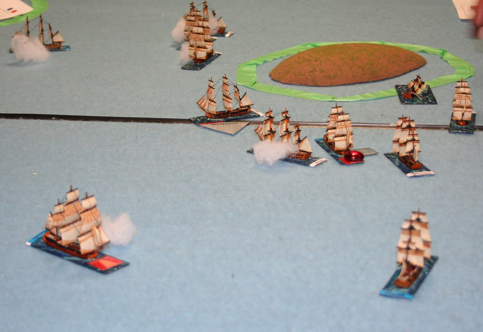 Trafalgar. The critical hits table of the latter was probably designed by a pyromaniac. For turn gages, circles of different radius are used. The bigger one, about 12 cm radius, could be tricky to use when there are lots of ships nearby.