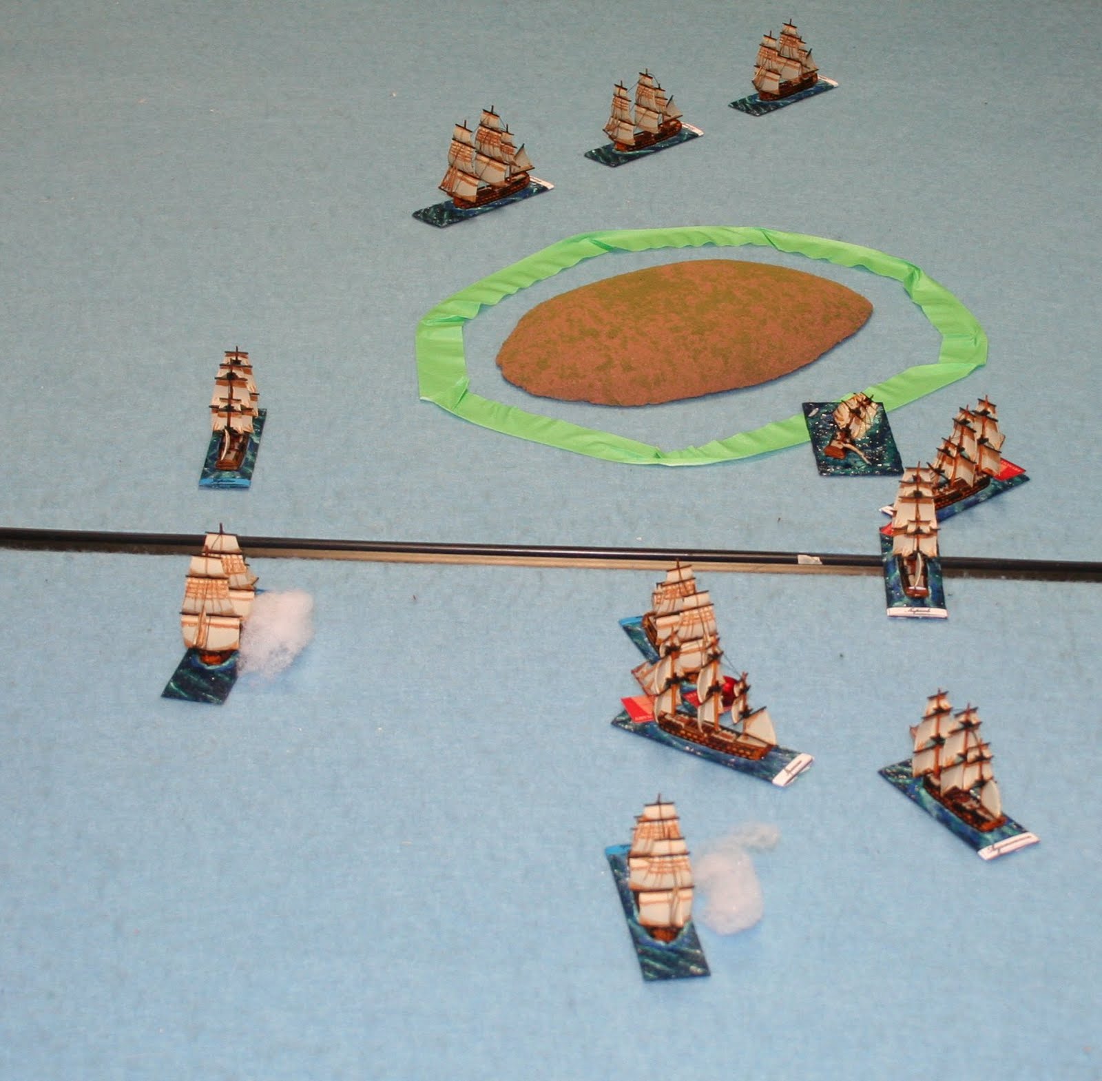 Here is the initial deployment. The allied squadron of 4 ships is trying to escape in the upper right corner. The British squadron, led by the