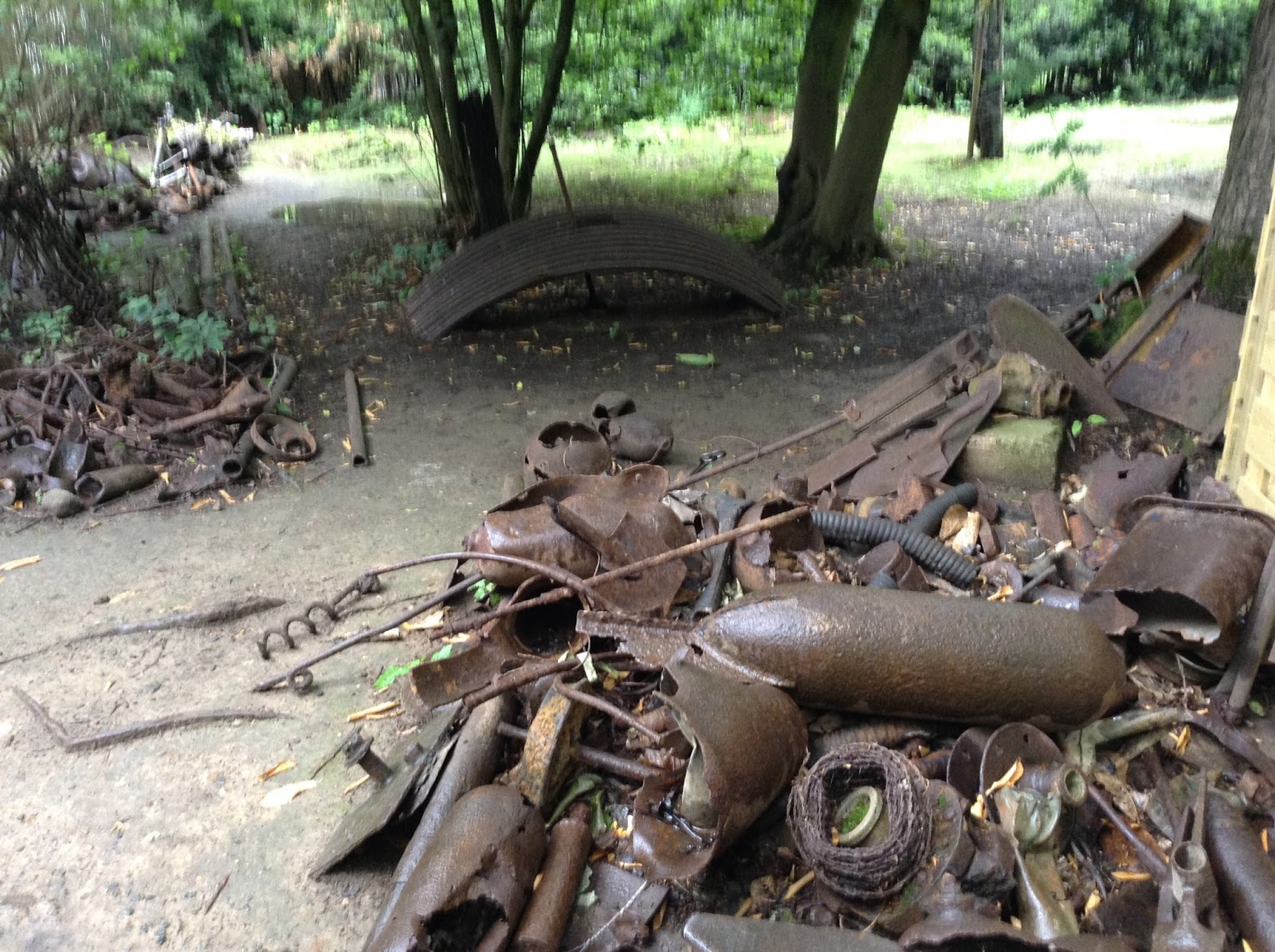 Some rusty battlefield scrap including a broken "toffee-apple" mortar.
