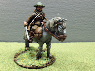 The four models are an officer-type with sabre, a chap aiming a pistol with rifle slung, and two troopers holding rifles. The horse selection that came with them was two galloping and two standing mounts. They painted very nicely as shown in the pics. Some might criticize the anatomy of the horses but I think they are characterful and "heroic" in proportion to match the style of the riders. The only point of criticism I have with the figures is that the facial detail seemed a bit "soft" on the troopers. I really like the mustachio'd officer though.