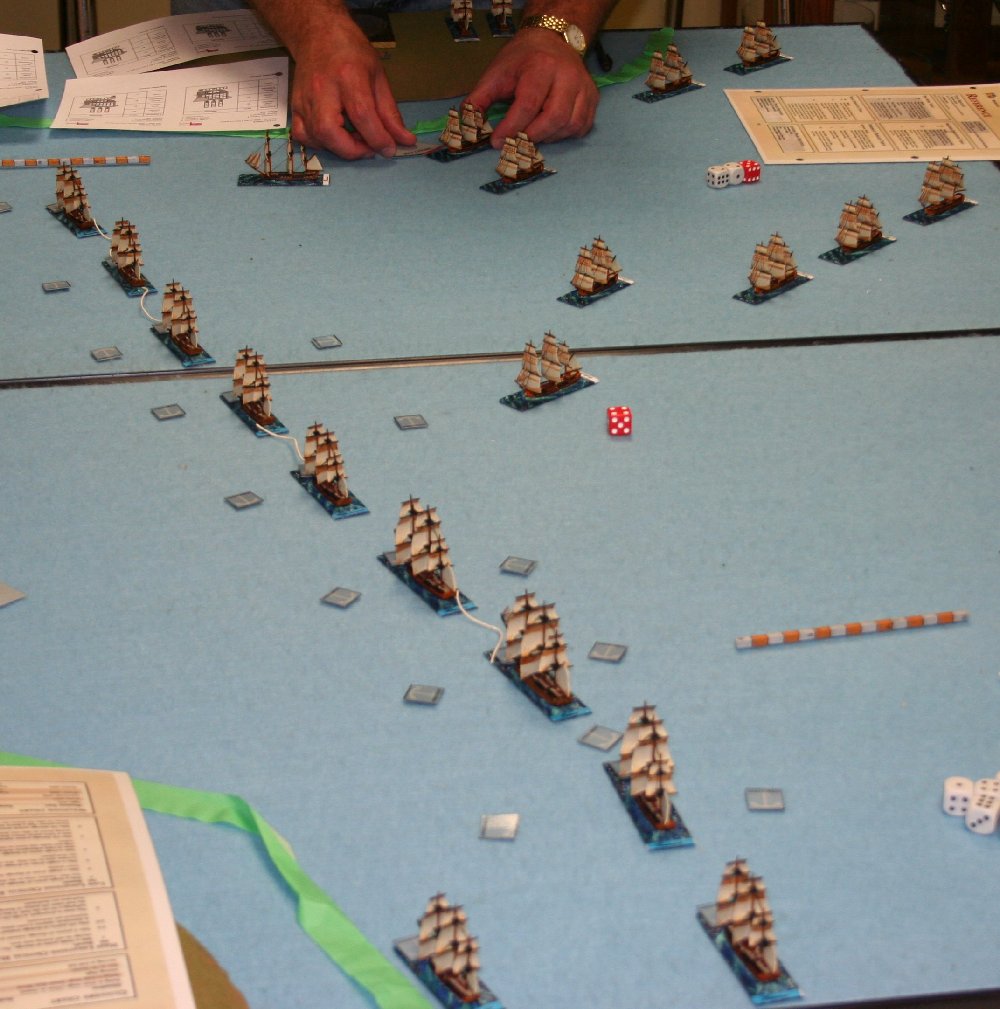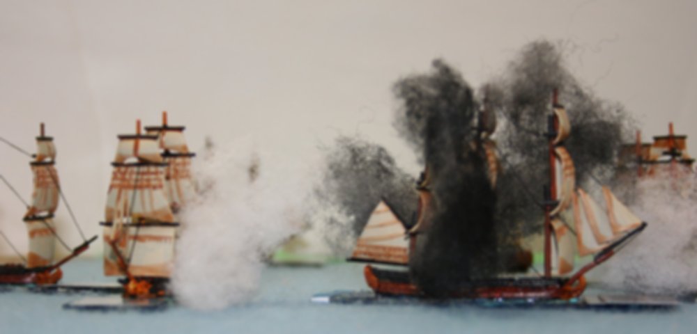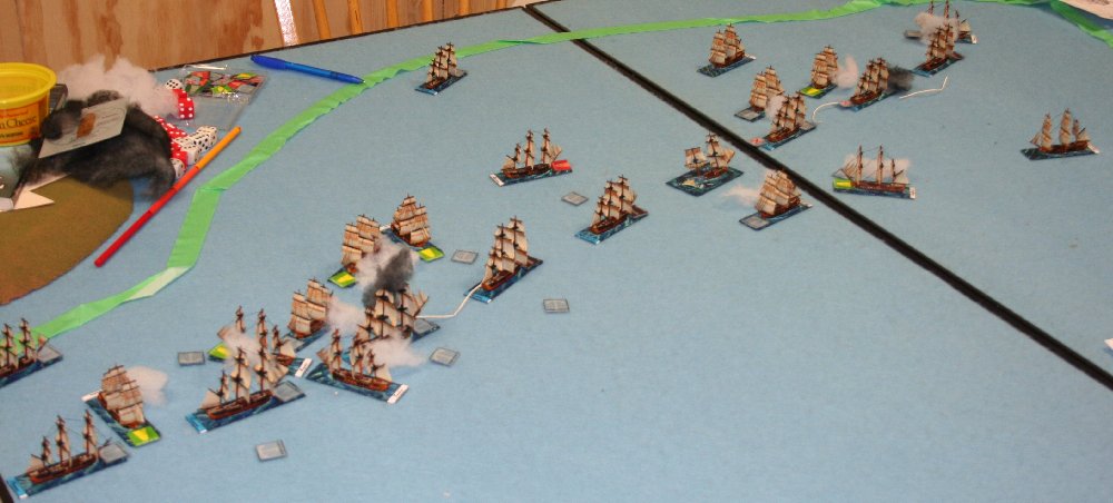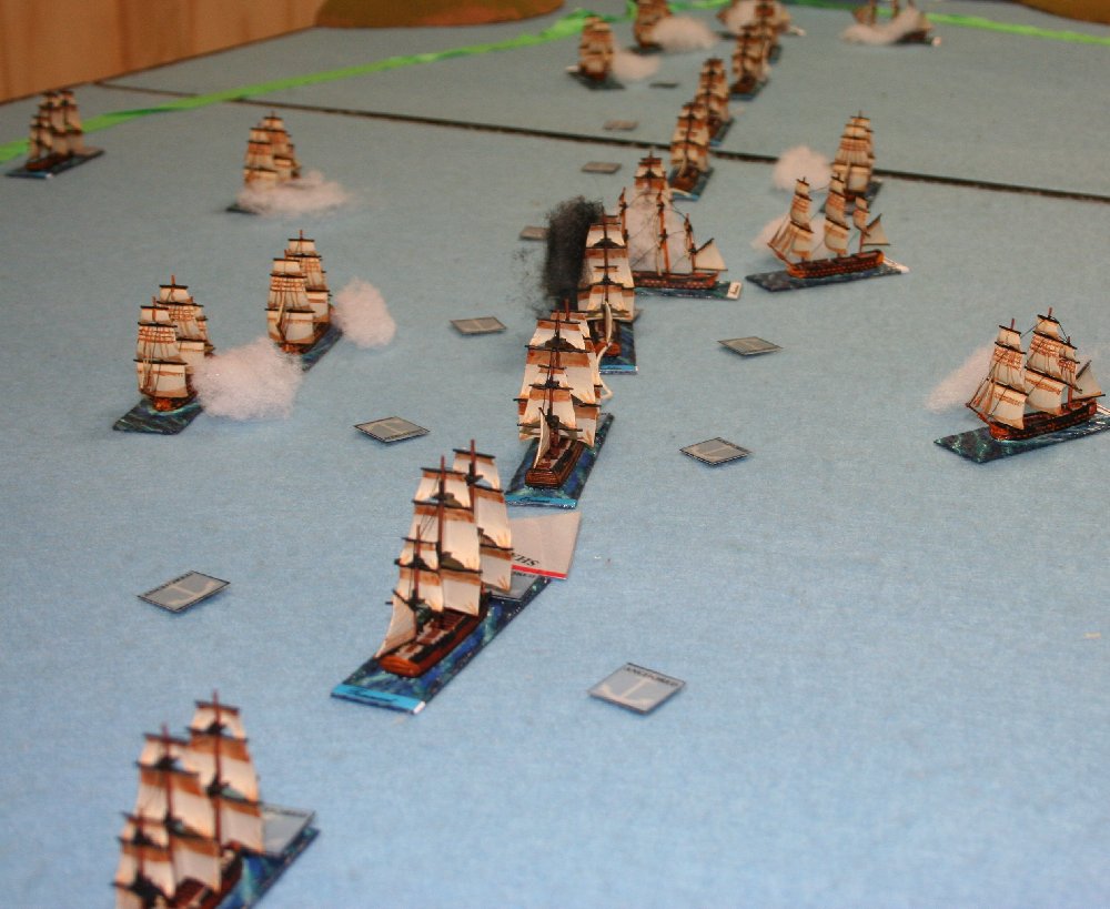 Half of Nelson's squadron just went through the French line which is being pounded from both sides. White puffs of smoke were helping the commanders keep track of which ships fired. In the background, Foley's line is shooting intensely on the French van.